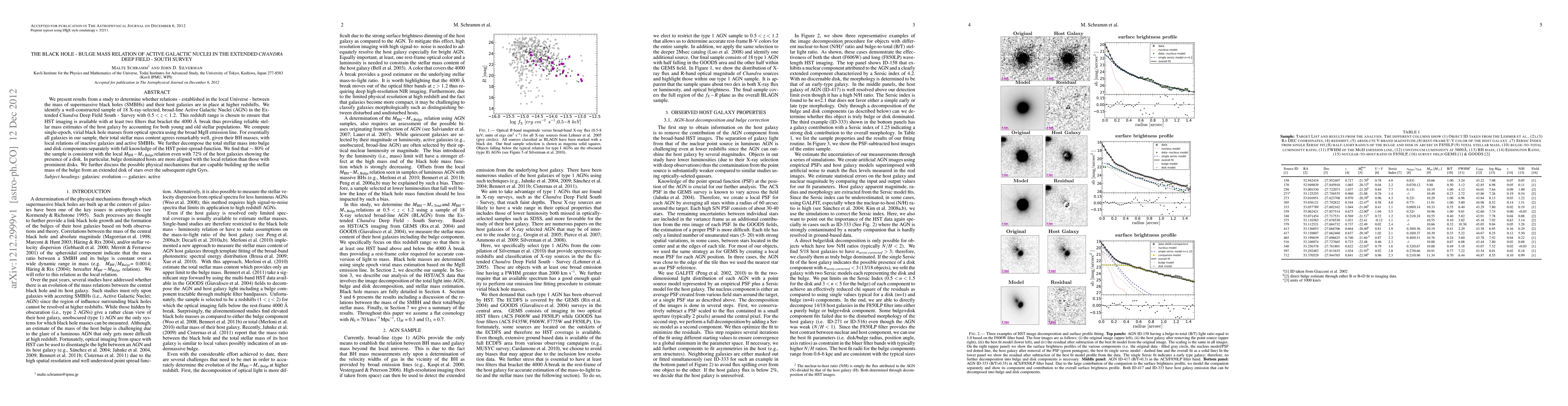 We present results from a study to determine whether relations, established in the local Universe, between the mass of supermassive black holes (SMBHs) and their host galaxies are in place at higher redshifts. We establish a well-constructed sample of 18 X-ray-selected, broad-line Active Galactic Nuclei (AGN) in the Extended Chandra Deep Field South - Survey with 0.5 < z < 1.2. This redshift range is chosen to ensure that HST imaging is available with at least two filters that bracket the 4000 Angstrom break thus providing reliable stellar mass estimates of the host galaxy by accounting for both young and old stellar populations. We compute single-epoch, virial black hole masses from optical spectra using the broad MgII emission line. For essentially all galaxies in our sample, their total stellar mass content agrees remarkably well, given their BH masses, with local relations of inactive galaxies and active SMBHs. We further decompose the total stellar mass into bulge and disk components separately with full knowledge of the HST point-spread-function. We find that ~80% of the sample is consistent with the local M_BH - M_Bulge relation even with 72% of the host galaxies showing the presence of a disk. In particular, bulge dominated hosts are more aligned with the local relation than those with prominent disks. We further discuss the possible physical mechanisms that are capable building up the stellar mass of the bulge from an extended disk of stars over the subsequent eight Gyrs.