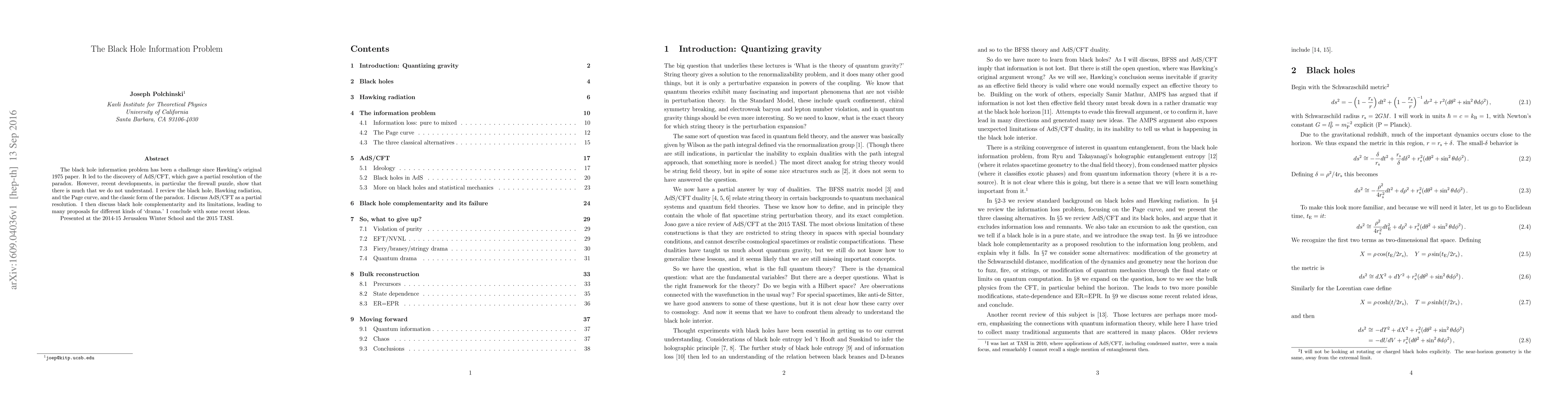 The black hole information problem has been a challenge since Hawking's original 1975 paper. It led to the discovery of AdS/CFT, which gave a partial resolution of the paradox. However, recent developments, in particular the firewall puzzle, show that there is much that we do not understand. I review the black hole, Hawking radiation, and the Page curve, and the classic form of the paradox. I discuss AdS/CFT as a partial resolution. I then discuss black hole complementarity and its limitations, leading to many proposals for different kinds of `drama.' I conclude with some recent ideas.