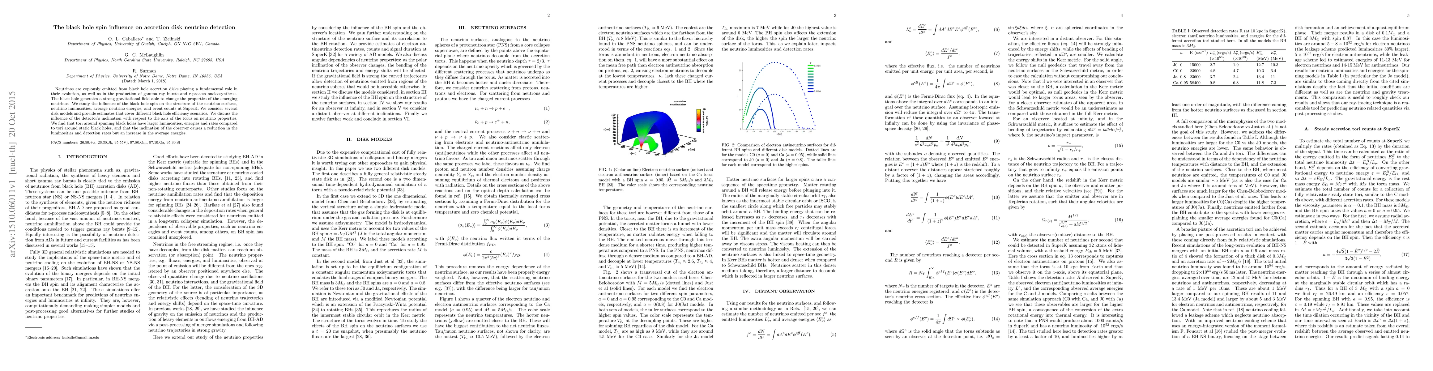 Neutrinos are copiously emitted from black hole accretion disks playing a fundamental role in their evolution, as well as in the production of gamma ray bursts and r-process nucleosynthesis. The black hole generates a strong gravitational field able to change the properties of the emerging neutrinos. We study the influence of the black hole spin on the structure of the neutrino surfaces, neutrino luminosities, average neutrino energies, and event counts at SuperK. We consider several disk models and provide estimates that cover different black hole efficiency scenarios. We discuss the influence of the detector's inclination with respect to the axis of the torus on neutrino properties. We find that tori around spinning black holes have larger luminosities, energies and rates compared to tori around static black holes, and that the inclination of the observer causes a reduction in the luminosities and detection rates but an increase in the average energies.