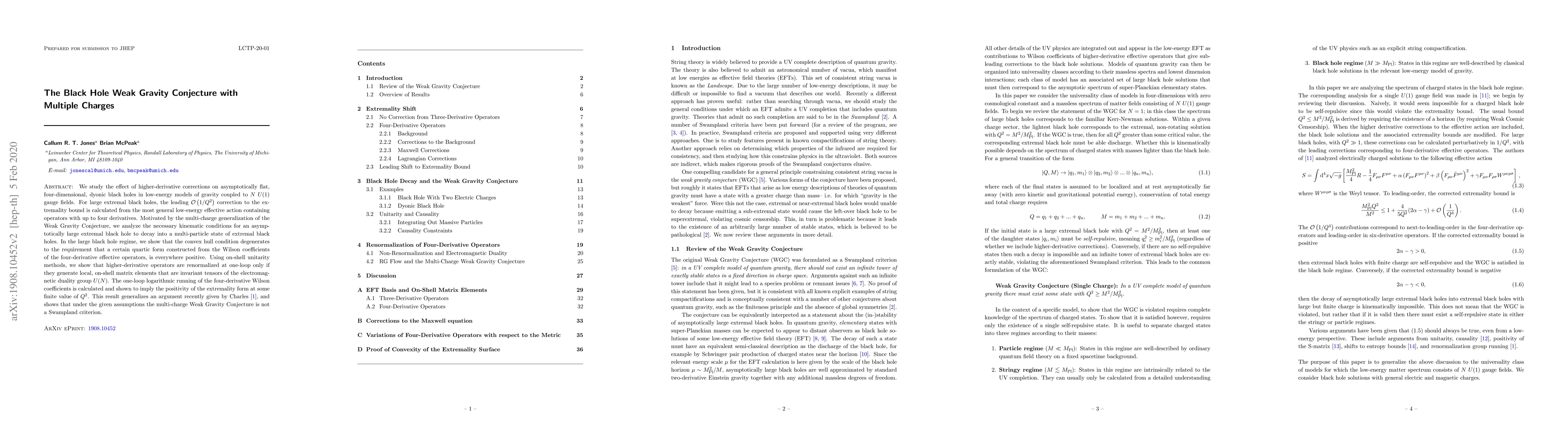 We study the effect of higher-derivative corrections on asymptotically flat, four-dimensional, non-rotating dyonic black holes in low-energy models of gravity coupled to $N$ $U(1)$ gauge fields. For large extremal black holes, the leading $\mathcal{O}\left(1/Q^2\right)$ correction to the extremality bound is calculated from the most general low-energy effective action containing operators with up to four derivatives. Motivated by the multi-charge generalization of the Weak Gravity Conjecture, we analyze the necessary kinematic conditions for an asymptotically large extremal black hole to decay into a multi-particle state of finite charge extremal black holes. In the large black hole regime, we show that the convex hull condition degenerates to the requirement that a certain quartic form, constructed from the Wilson coefficients of the four-derivative effective operators, is everywhere positive. Using on-shell unitarity methods, we show that higher-derivative operators are renormalized at one-loop only if they generate local, on-shell matrix elements that are invariant tensors of the electromagnetic duality group $U(N)$. The one-loop logarithmic running of the four-derivative Wilson coefficients is calculated and shown to imply the positivity of the extremality form at some finite value of $Q^2$. This result generalizes a recently given argument by Charles, and shows that under the given assumptions the multi-charge Weak Gravity Conjecture is not a Swampland criterion.