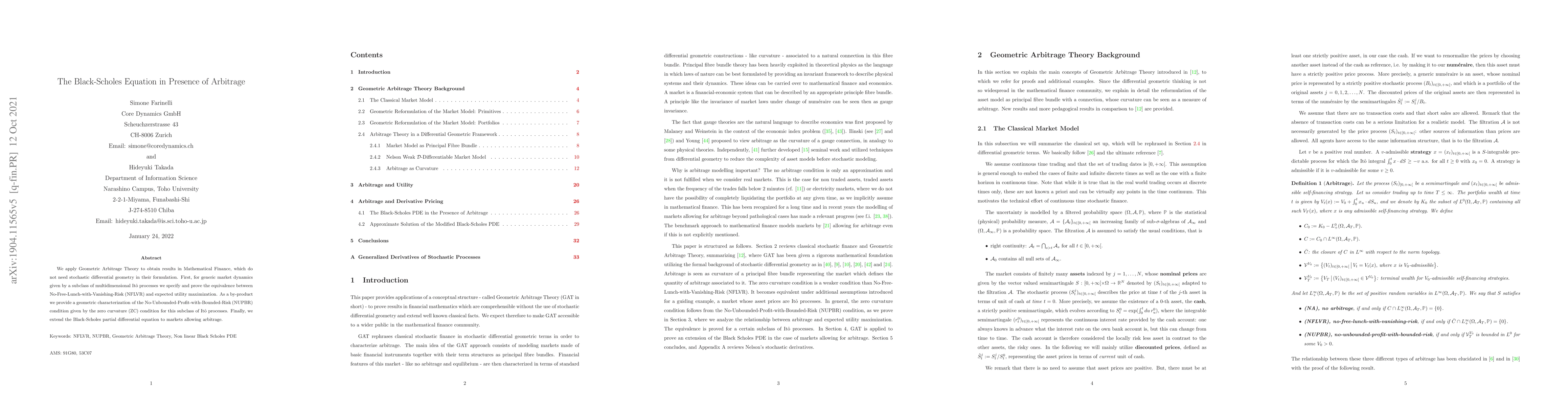 We apply Geometric Arbitrage Theory to obtain results in Mathematical Finance, which do not need stochastic differential geometry in their formulation. First, for a generic market dynamics given by a multidimensional It\^o's process we specify and prove the equivalence between (NFLVR) and expected utility maximization. As a by-product we provide a geometric characterization of the (NUPBR) condition given by the zero curvature (ZC) condition. Finally, we extend the Black-Scholes PDE to markets allowing arbitrage.