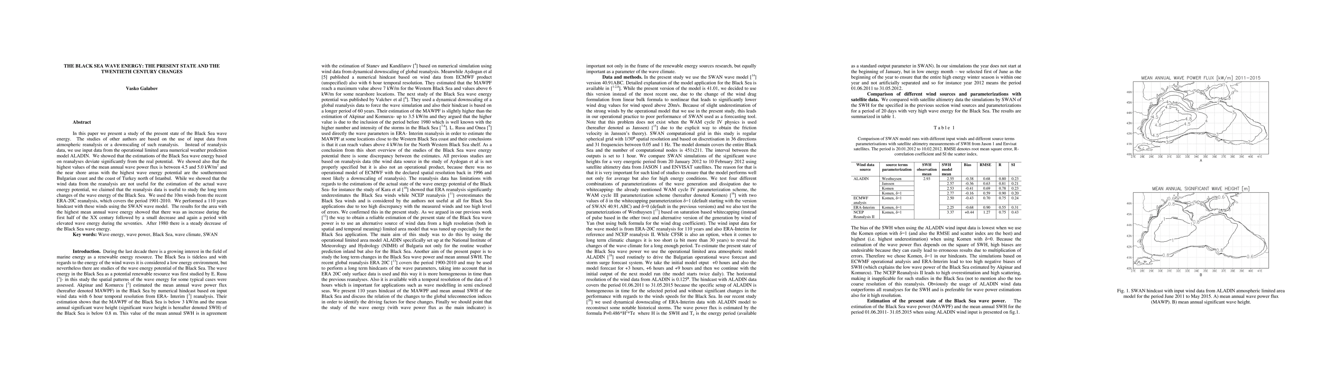The study of Black Sea wave energy found significant deviations between reanalysis data estimates and actual values, with highest wave power fluxes occurring in southern Bulgarian coast and north of Istanbul. The wave energy has shown an increase during the 20th century's first half, followed by a decline, but then stabilized after 1980.