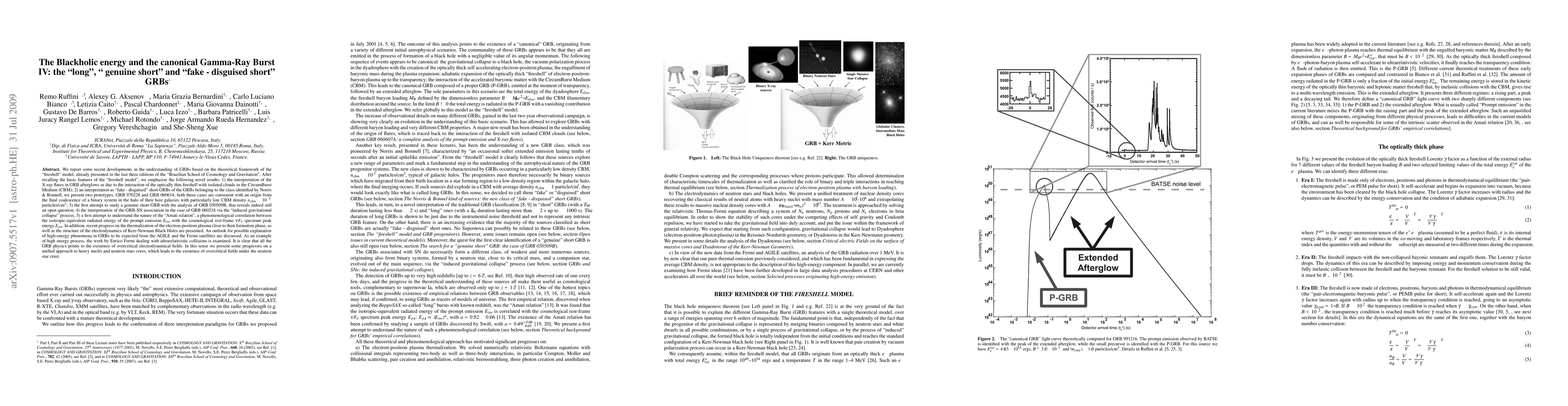 (Shortened) [...] After recalling the basic features of the "fireshell model", we emphasize the following novel results: 1) the interpretation of the X-ray flares in GRB afterglows as due to the interaction of the optically thin fireshell with isolated clouds in the CircumBurst Medium (CBM); 2) an interpretation as "fake - disguised" short GRBs of the GRBs belonging to the class identified by Norris & Bonnell [...] consistent with an origin from the final coalescence of a binary system in the halo of their host galaxies with particularly low CBM density [...]; 3) the first attempt to study a genuine short GRB with the analysis of GRB 050509B, that reveals indeed still an open question; 4) the interpretation of the GRB-SN association in the case of GRB 060218 via the "induced gravitational collapse" process; 5) a first attempt to understand the nature of the "Amati relation", a phenomenological correlation between the isotropic-equivalent radiated energy of the prompt emission E_{iso} with the cosmological rest-frame \nu F_{\nu} spectrum peak energy E_{p,i}. In addition, recent progress on the thermalization of the electron-positron plasma close to their formation phase, as well as the structure of the electrodynamics of Kerr-Newman Black Holes are presented. An outlook for possible explanation of high-energy phenomena in GRBs to be expected from the AGILE and the Fermi satellites are discussed. As an example of high energy process, the work by Enrico Fermi dealing with ultrarelativistic collisions is examined. It is clear that all the GRB physics points to the existence of overcritical electrodynamical fields. In this sense we present some progresses on a unified approach to heavy nuclei and neutron stars cores, which leads to the existence of overcritical fields under the neutron star crust.