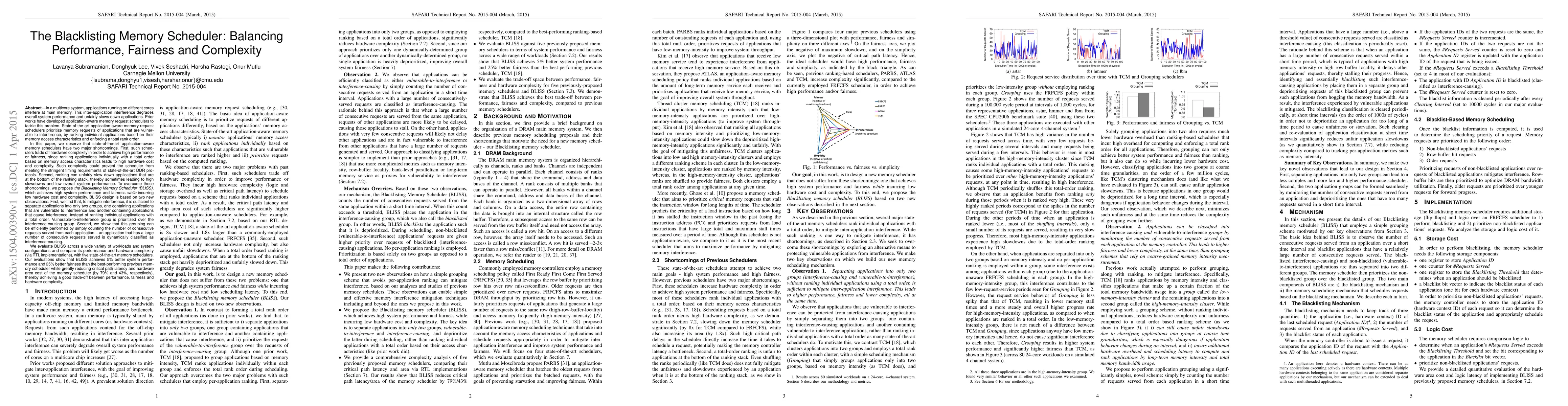 This paper proposes the Blacklisting Memory Scheduler (BLISS) to address inter-application memory interference in multicore systems, balancing performance, fairness, and hardware complexity. BLISS separates applications into two groups based on request patterns, achieving better performance and fairness while significantly reducing hardware complexity compared to existing schedulers.