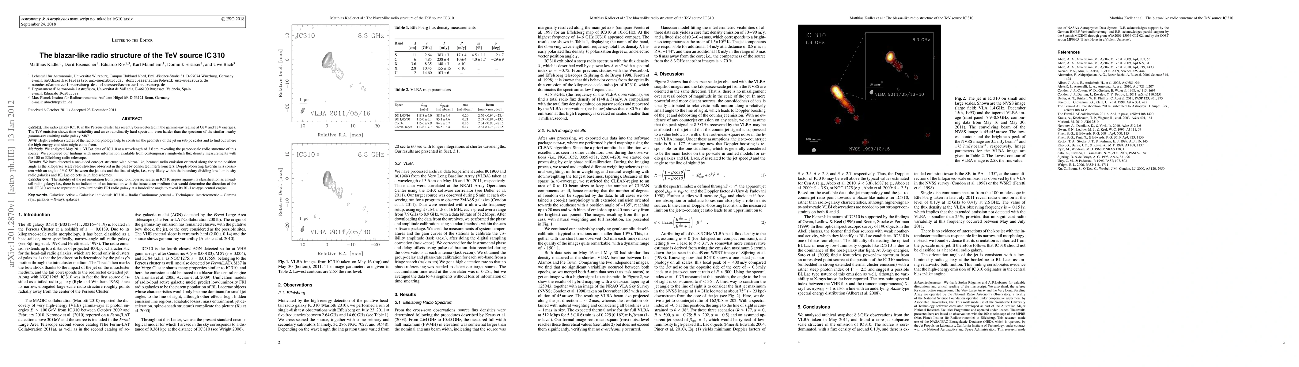 The TeV source IC310 in the Perseus cluster exhibits a blazar-like radio structure with a stable jet orientation from parsec to kiloparsec scales, indicating it is likely a low-luminosity FRI radio galaxy with a BL Lac-type central engine.