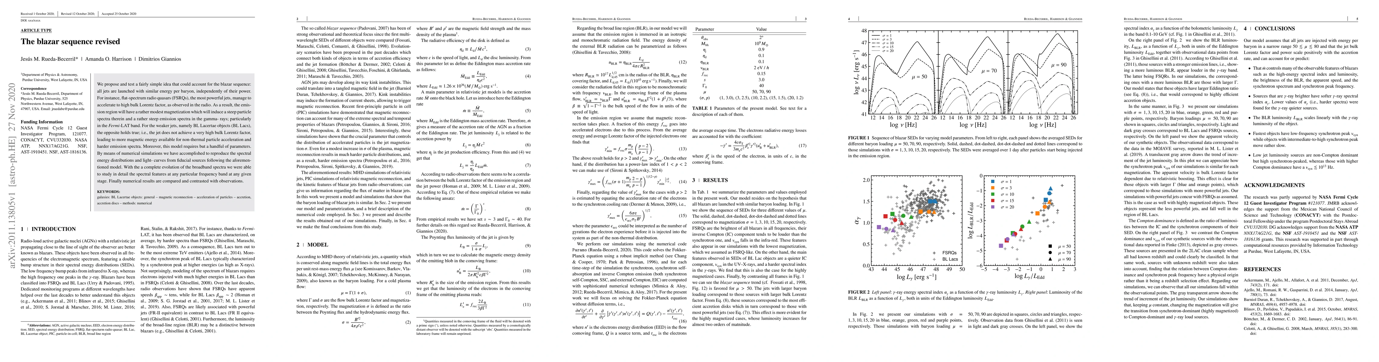 We propose and test a fairly simple idea that could account for the blazar sequence: all jets are launched with similar energy per baryon, independently of their power. For instance, flat-spectrum radio quasars (FSRQs), the most powerful jets, manage to accelerate to high bulk Lorentz factor, as observed in the radio. As a result, the emission region will have a rather modest magnetization which will induce a steep particle spectra therein and a rather steep emission spectra in the gamma-rays; particularly in the \textit{Fermi}-LAT band. For the weaker jets, namely BL Lacertae objects (BL Lacs), the opposite holds true; i.e., the jet does not achieve a very high bulk Lorentz factor, leading to more magnetic energy available for non-thermal particle acceleration and harder emission spectra. Moreover, this model requires but a handful of parameters. By means of numerical simulations we have accomplished to reproduce the spectral energy distributions and light-curves from fiducial sources following the aforementioned model. With the a complete evolution of the broadband spectra we were able to study in detail the spectral features at any particular frequency band at any given stage. Finally numerical results are compared and contrasted with observations.