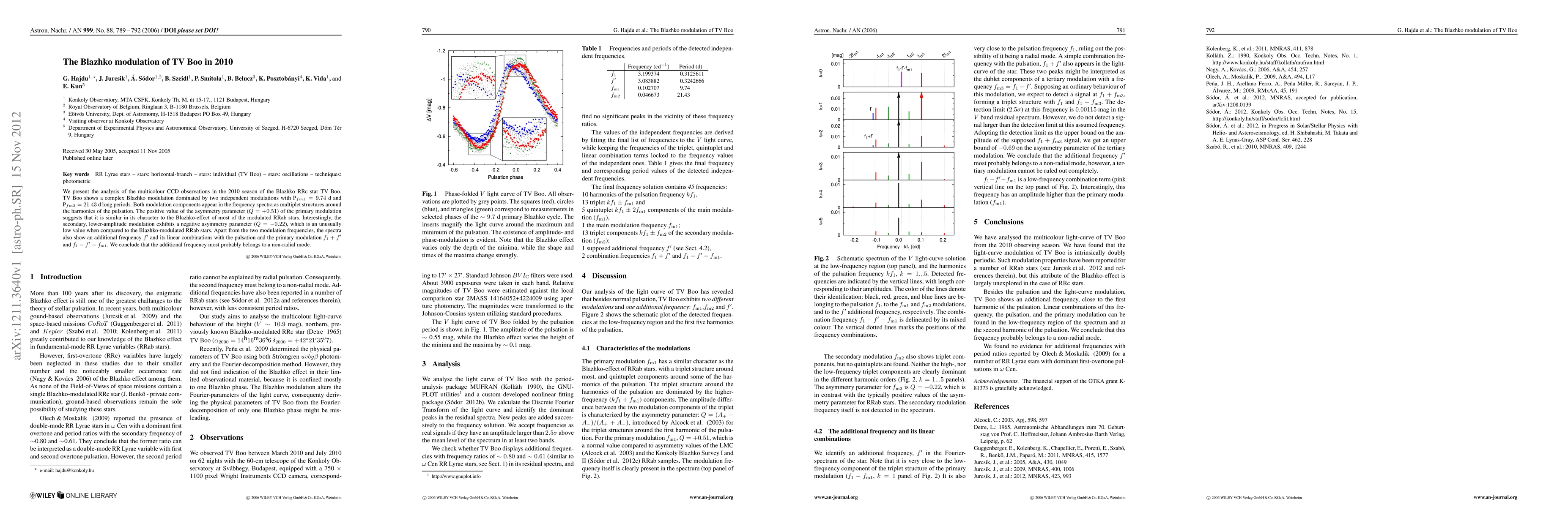 This study analyzes TV Boo's 2010 Blazhko modulation, revealing two independent modulations with periods of 9.74 days and 21.43 days. The primary modulation shows a positive asymmetry, typical of RRab stars, while the secondary modulation has an unusually low negative asymmetry. Additional frequencies suggest a non-radial mode.