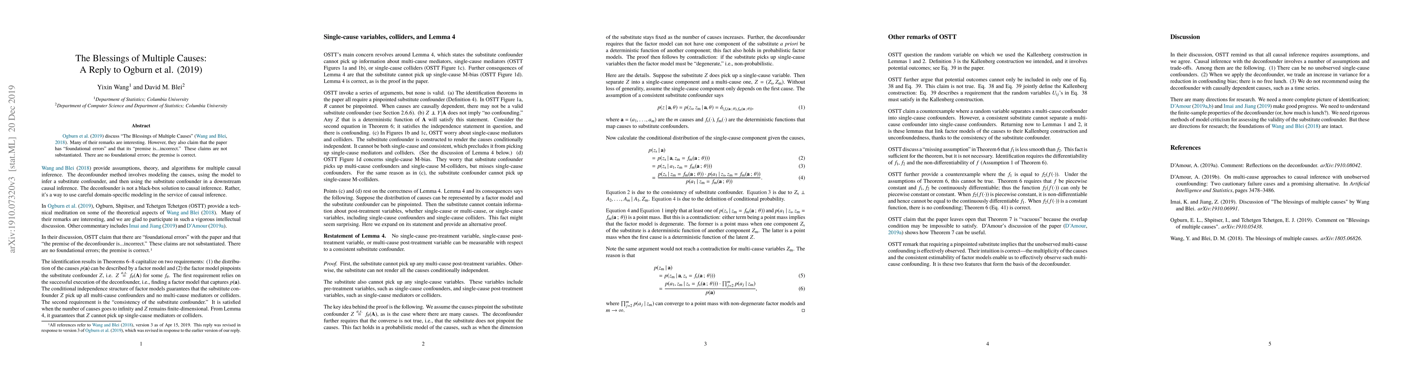 Ogburn et al. (2019, arXiv:1910.05438) discuss "The Blessings of Multiple Causes" (Wang and Blei, 2018, arXiv:1805.06826). Many of their remarks are interesting. But they also claim that the paper has "foundational errors" and that its "premise is...incorrect." These claims are not substantiated. There are no foundational errors; the premise is correct.