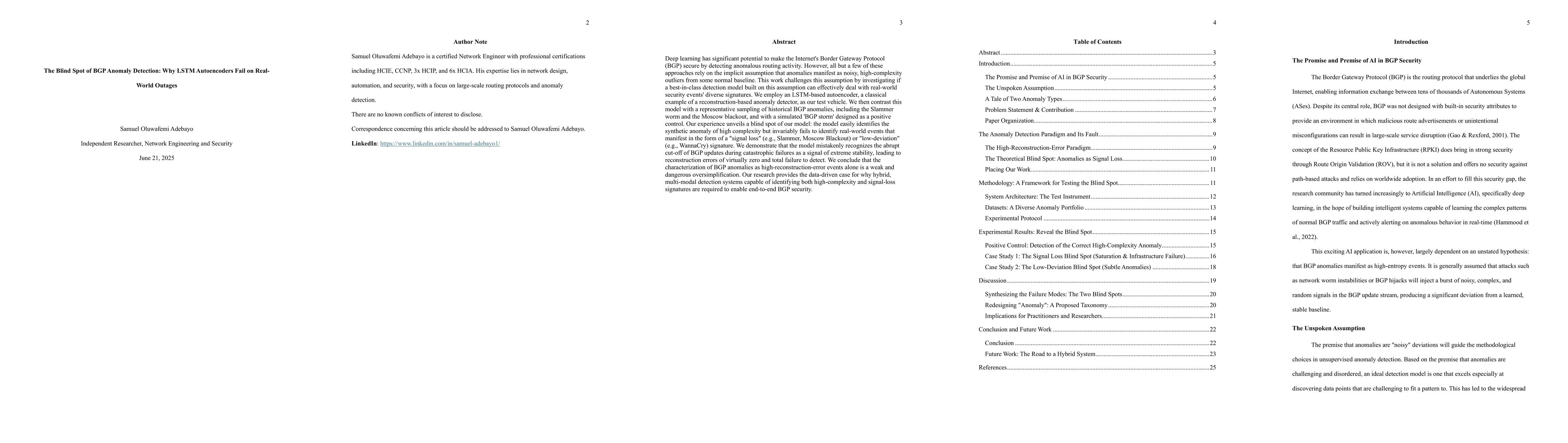 Deep learning has significant potential to make the Internet's Border Gateway Protocol (BGP) secure by detecting anomalous routing activity. However, all but a few of these approaches rely on the implicit assumption that anomalies manifest as noisy, high-complexity outliers from some normal baseline. This work challenges this assumption by investigating if a best-in-class detection model built on this assumption can effectively deal with real-world security events' diverse signatures. We employ an LSTM-based autoencoder, a classical example of a reconstruction-based anomaly detector, as our test vehicle. We then contrast this model with a representative sampling of historical BGP anomalies, including the Slammer worm and the Moscow blackout, and with a simulated 'BGP storm' designed as a positive control. Our experience unveils a blind spot of our model: the model easily identifies the synthetic anomaly of high complexity but invariably fails to identify real-world events that manifest in the form of a "signal loss" (e.g., Slammer, Moscow Blackout) or "low-deviation" (e.g., WannaCry) signature. We demonstrate that the model mistakenly recognizes the abrupt cut-off of BGP updates during catastrophic failures as a signal of extreme stability, leading to reconstruction errors of virtually zero and total failure to detect. We conclude that the characterization of BGP anomalies as high-reconstruction-error events alone is a weak and dangerous oversimplification. Our research provides the data-driven case for why hybrid, multi-modal detection systems capable of identifying both high-complexity and signal-loss signatures are required to enable end-to-end BGP security.