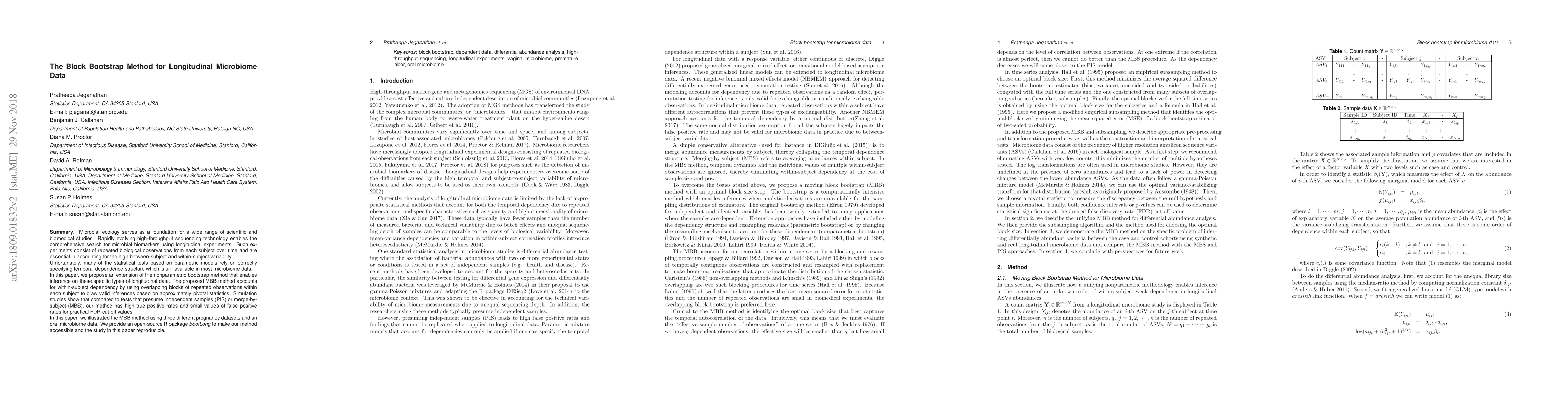 Microbial ecology serves as a foundation for a wide range of scientific and biomedical studies. Rapidly-evolving high-throughput sequencing technology enables the comprehensive search for microbial biomarkers using longitudinal experiments. Such experiments consist of repeated biological observations from each subject over time and are essential in accounting for the high between-subject and within-subject variability. Unfortunately, many of the statistical tests based on parametric models rely on correctly specifying temporal dependence structure which is unavailable in most microbiome data. In this paper, we propose an extension of the nonparametric bootstrap method that enables inference on these types longitudinal data. The proposed moving block bootstrap (MBB) method accounts for within-subject dependency by using overlapping blocks of repeated observations within each subject to draw valid inferences based on approximately pivotal statistics. Our simulation studies show an increase in power compared to merge-by-subject (MBS) strategies. We also show that compared to tests that presume independent samples (PIS), our proposed method reduces false microbial biomarker discovery rates. In this paper, we illustrated the MBB method using three different pregnancy data and an oral microbiome data. We provide an open-source R package https://github.com/PratheepaJ/bootLong to make our method accessible and the study in this paper reproducible.