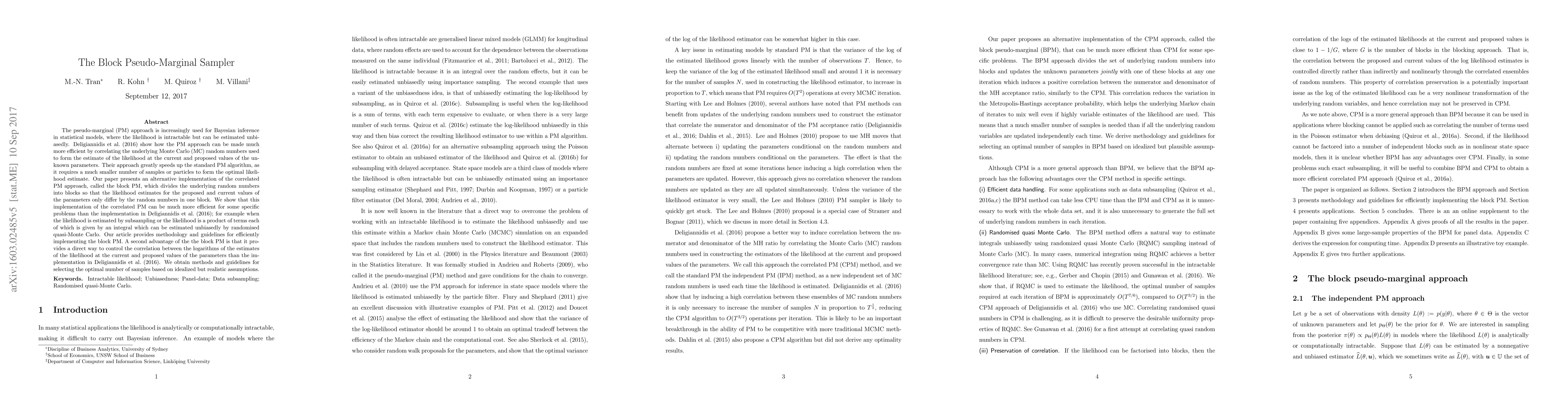 A new approach called the block pseudo-marginal sampler is presented for Bayesian inference in statistical models where the likelihood is intractable, offering improved efficiency compared to existing methods.