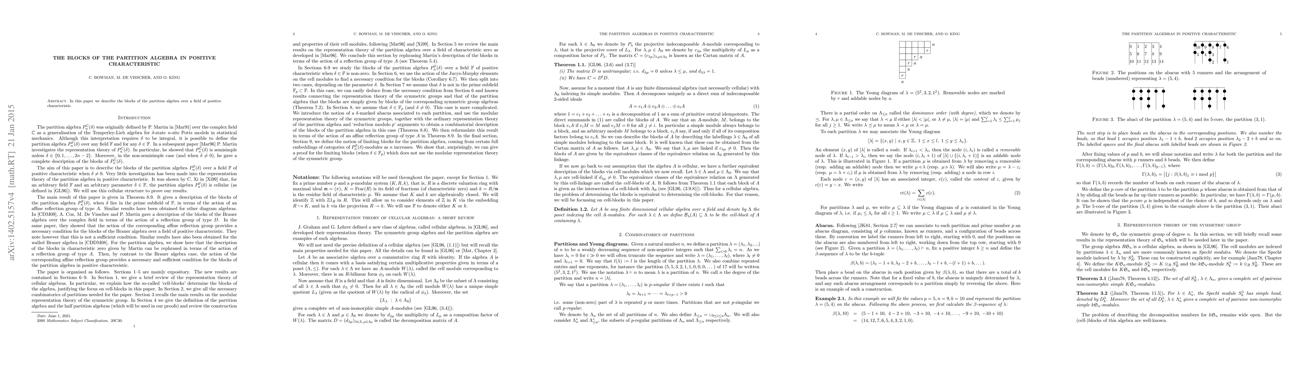 In this paper we describe the blocks of the partition algebra over a field of positive characteristic.