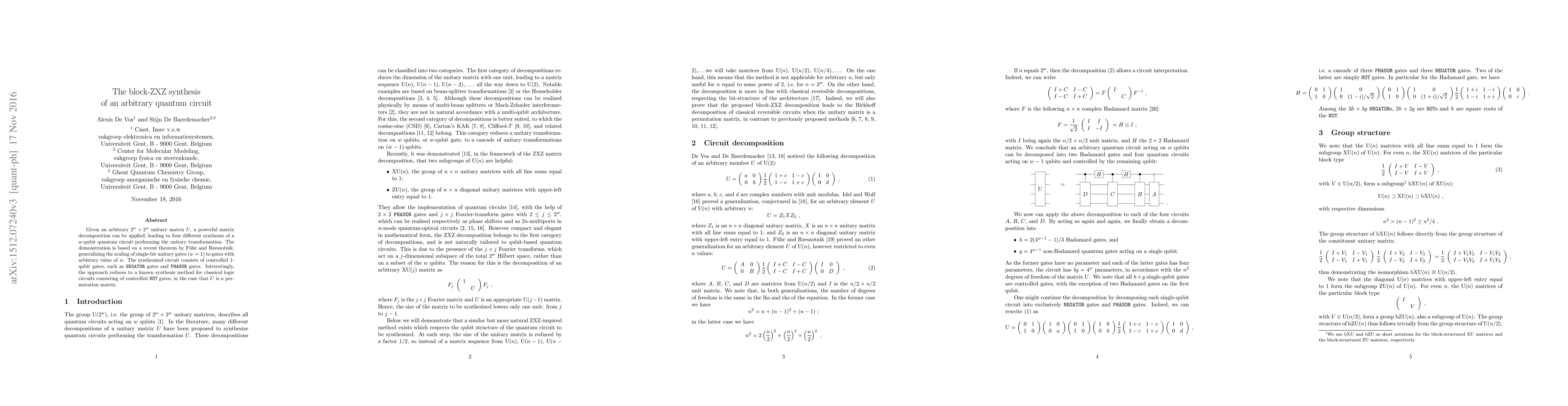 This paper presents a block-ZXZ synthesis method for constructing $w$-qubit quantum circuits that perform an arbitrary unitary transformation, utilizing a matrix decomposition theorem. The synthesized circuits use controlled 1-qubit gates, reducing to classical logic circuit synthesis when the unitary matrix is a permutation matrix.
