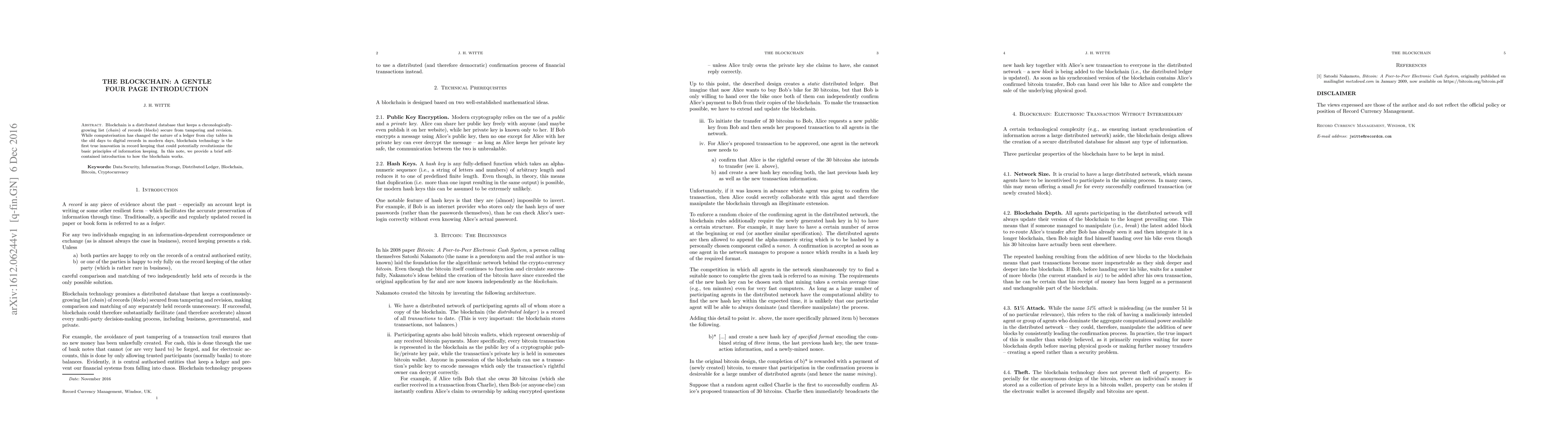 This paper introduces blockchain technology as a distributed database that keeps a secure, chronologically-growing list of records. It aims to revolutionize basic principles of information keeping through its innovation in record-keeping.