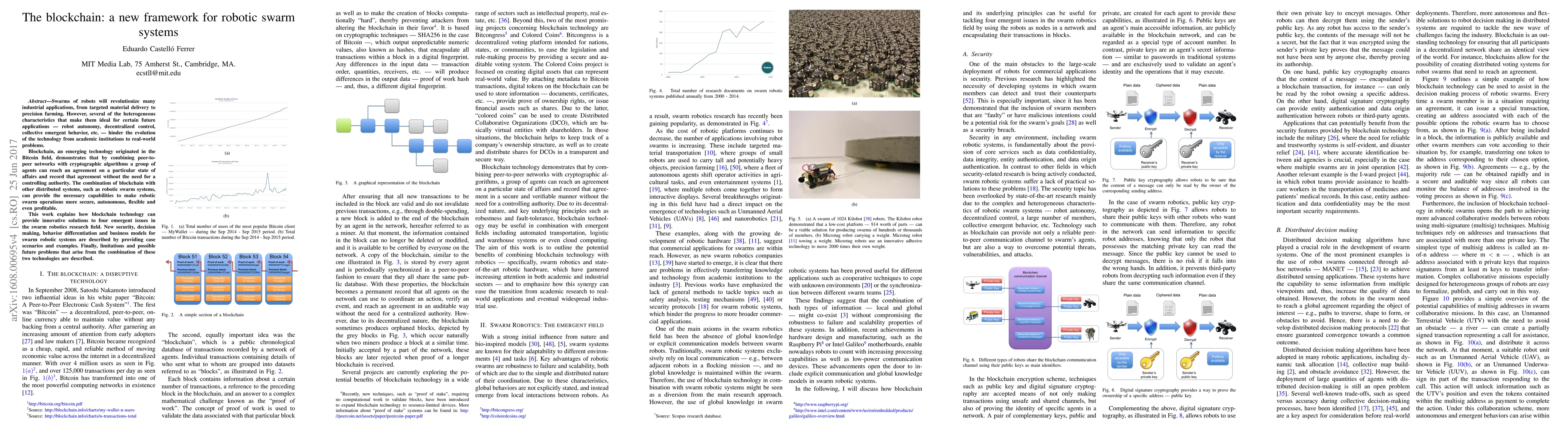 Swarms of robots will revolutionize many industrial applications, from targeted material delivery to precision farming. However, several of the heterogeneous characteristics that make them ideal for certain future applications --- robot autonomy, decentralized control, collective emergent behavior, etc. --- hinder the evolution of the technology from academic institutions to real-world problems. Blockchain, an emerging technology originated in the Bitcoin field, demonstrates that by combining peer-to-peer networks with cryptographic algorithms a group of agents can reach an agreement on a particular state of affairs and record that agreement without the need for a controlling authority. The combination of blockchain with other distributed systems, such as robotic swarm systems, can provide the necessary capabilities to make robotic swarm operations more secure, autonomous, flexible and even profitable. This work explains how blockchain technology can provide innovative solutions to four emergent issues in the swarm robotics research field. New security, decision making, behavior differentiation and business models for swarm robotic systems are described by providing case scenarios and examples. Finally, limitations and possible future problems that arise from the combination of these two technologies are described.
