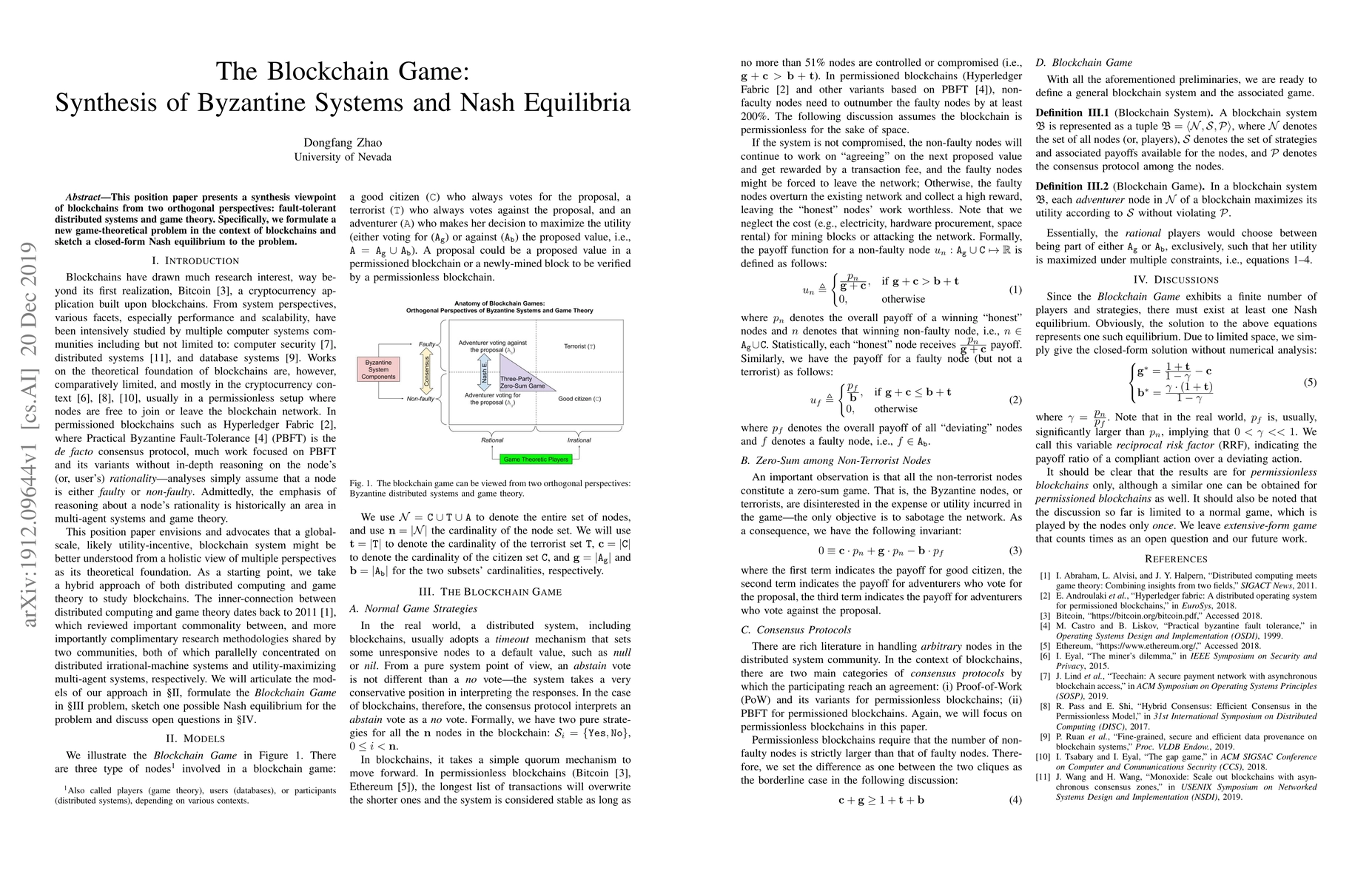 This position paper presents a synthesis viewpoint of blockchains from two orthogonal perspectives: fault-tolerant distributed systems and game theory. Specifically, we formulate a new game-theoretical problem in the context of blockchains and sketch a closed-form Nash equilibrium to the problem.