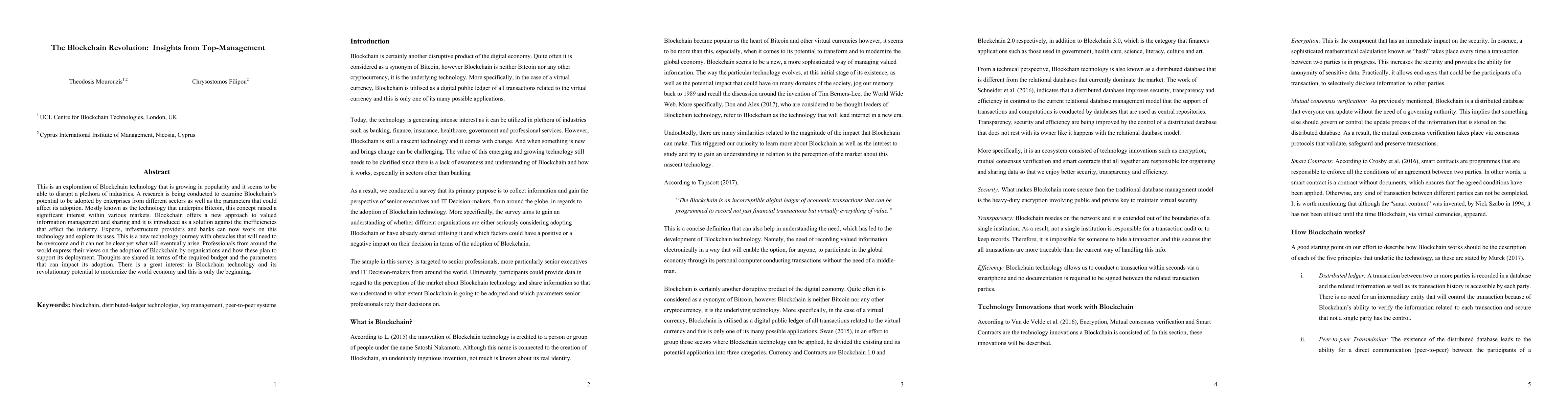 This is an exploration of Blockchain technology that is growing in popularity and it seems to be able to disrupt a plethora of industries. A research is being conducted to examine Blockchain potential to be adopted by enterprises from different sectors as well as the parameters that could affect its adoption. Mostly known as the technology that underpins Bitcoin, this concept raised a significant interest within various markets. Blockchain offers a new approach to valued information management and sharing and it is introduced as a solution against the inefficiencies that affect the industry. Experts, infrastructure providers and banks can now work on this technology and explore its uses. This is a new technology journey with obstacles that will need to be overcome and it can not be clear yet what will eventually arise. Professionals from around the world express their views on the adoption of Blockchain by organisations and how these plan to support its deployment. Thoughts are shared in terms of the required budget and the parameters that can impact its adoption. There is a great interest in Blockchain technology and its revolutionary potential to modernize the world economy and this is only the beginning.