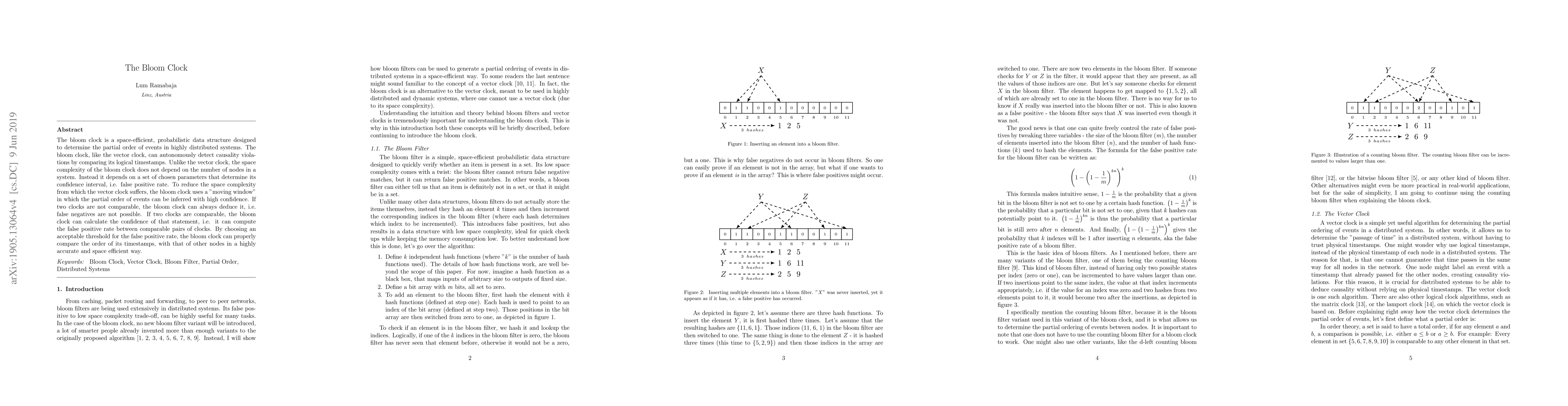 The Bloom Clock is a space-efficient, probabilistic data structure for determining event causality in distributed systems, reducing space complexity by using a 'moving window' and a chosen false positive rate, while ensuring no false negatives. It compares the partial order of events with high accuracy and efficiency.