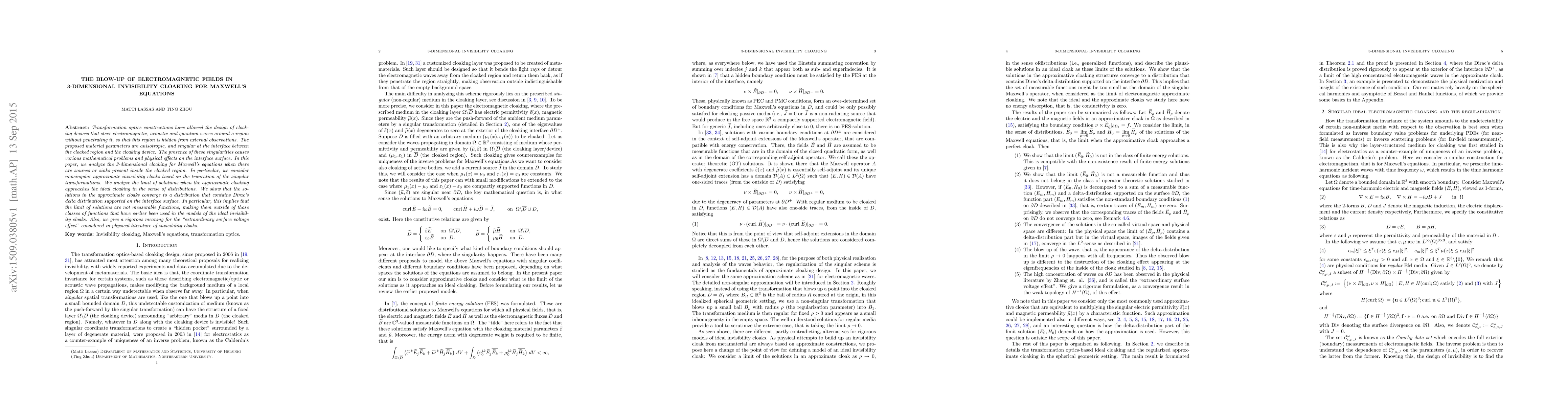 Transformation optics constructions have allowed the design of cloaking devices that steer electromagnetic, acoustic and quantum waves around a region without penetrating it, so that this region is hidden from external observations. The proposed material parameters are anisotropic, and singular at the interface between the cloaked region and the cloaking device. The presence of these singularities causes various mathematical problems and physical effects on the interface surface. In this paper, we analyze the 3-dimensional cloaking for Maxwell's equations when there are sources or sinks present inside the cloaked region. In particular, we consider nonsingular approximate invisibility cloaks based on the truncation of the singular transformations. We analyze the limit of solutions when the approximate cloaking approaches the ideal cloaking in the sense of distributions. We show that the solutions in the approximate cloaks converge to a distribution that contains Dirac's delta distribution supported on the interface surface. In particular, this implies that the limit of solutions are not measurable functions, making them outside of those classes of functions that have earlier been used in the models of the ideal invisibility cloaks. Also, we give a rigorous meaning for the "extraordinary surface voltage effect" considered in physical literature of invisibility cloaks.