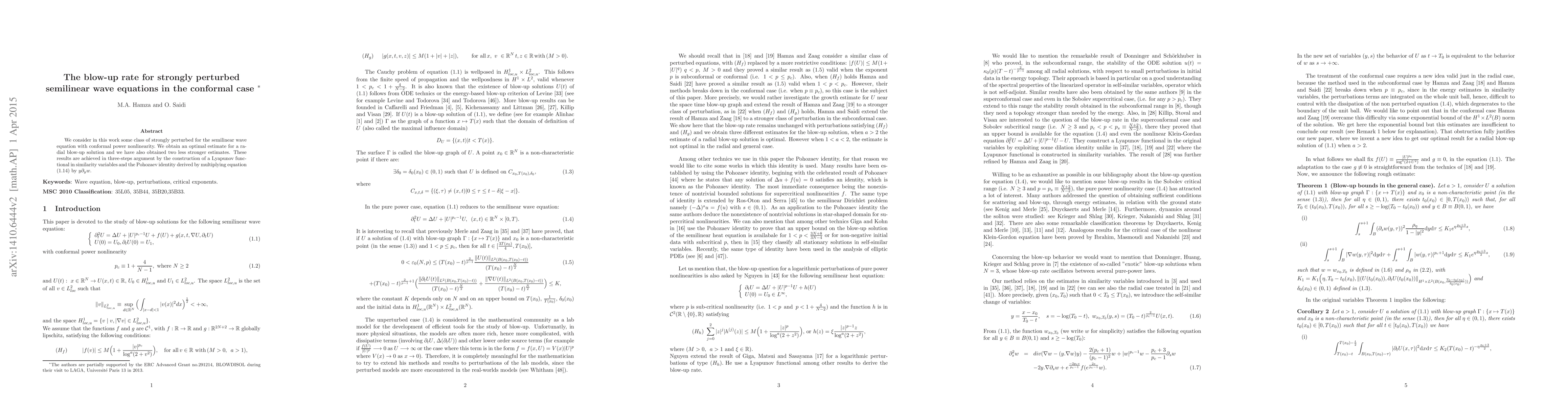 Summary: This paper investigates strongly perturbed semilinear wave equations with conformal power nonlinearity, deriving an optimal blow-up rate for a radial solution and two additional estimates through a three-step method involving a Lyapunov functional and the Pohozaev identity.