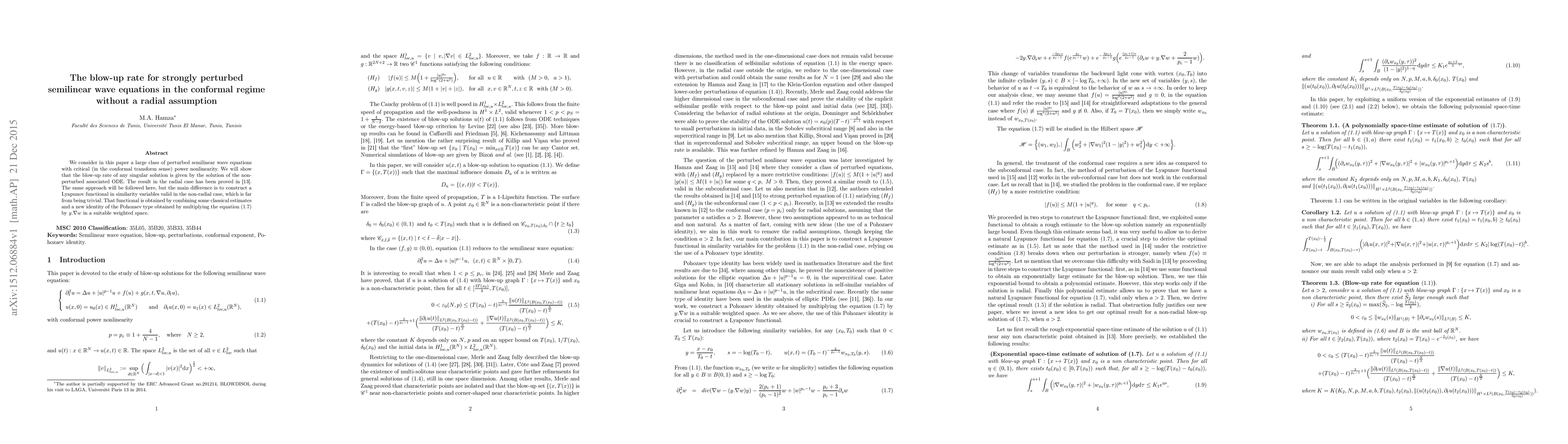 We consider in this paper a large class of perturbed semilinear wave equations with critical (in the conformal transform sense) power nonlinearity. We will show that the blow-up rate of any singular solution is given by the solution of the non-perturbed associated ODE. The result in the radial case has been proved in [13]. The same approach will be followed here, but the main difference is to construct a Lyapunov functional in similarity variables valid in the non-radial case, which is far from being trivial. That functional is obtained by combining some classical estimates and a new identity of the Pohozaev type.