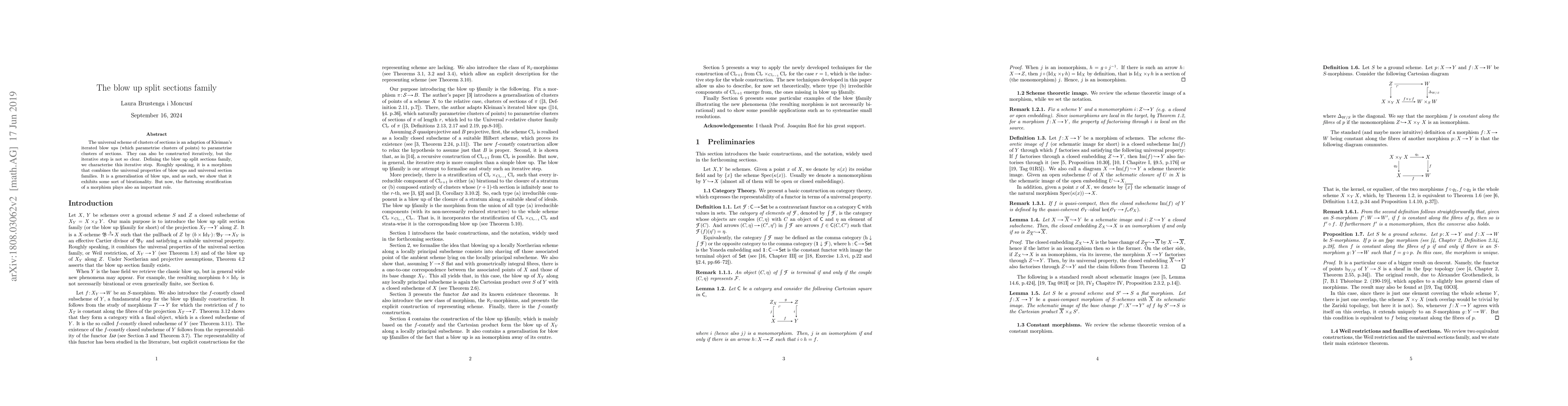 The universal scheme of clusters of sections is an adaption of Kleiman's iterated blow ups (which parametrise clusters of points) to parametrise clusters of sections. They can also be constructed iteratively, but the iterative step is not so clear. Defining the blow up split sections family, we characterise this iterative step. Roughly speaking, it is a morphism that combines the universal properties of blow ups and universal section families. It is a generalisation of blow ups, and as such, we show that it exhibits some sort of birationality. But now, the flattening stratification of a morphism plays also an important role.