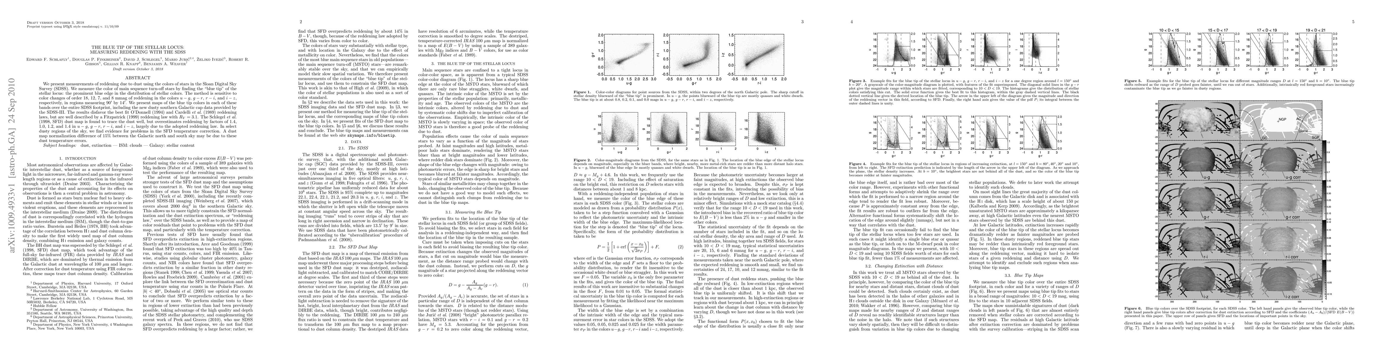 We present measurements of reddening due to dust using the colors of stars in the Sloan Digital Sky Survey (SDSS). We measure the color of main sequence turn-off stars by finding the "blue tip" of the stellar locus: the prominent blue edge in the distribution of stellar colors. The method is sensitive to color changes of order 18, 12, 7, and 8 mmag of reddening in the colors u-g, g-r, r-i, and i-z, respectively, in regions measuring 90' by 14'. We present maps of the blue tip colors in each of these bands over the entire SDSS footprint, including the new dusty southern Galactic cap data provided by the SDSS-III. The results disfavor the best fit O'Donnell (1994) and Cardelli et al. (1989) reddening laws, but are well described by a Fitzpatrick (1999) reddening law with R_V = 3.1. The SFD dust map is found to trace the dust well, but overestimates reddening by factors of 1.4, 1.0, 1.2, and 1.4 in u-g, g-r, r-i, and i-z, largely due to the adopted reddening law. In select dusty regions of the sky, we find evidence for problems in the SFD temperature correction. A dust map normalization difference of 15% between the Galactic north and south sky may be due to these dust temperature errors.