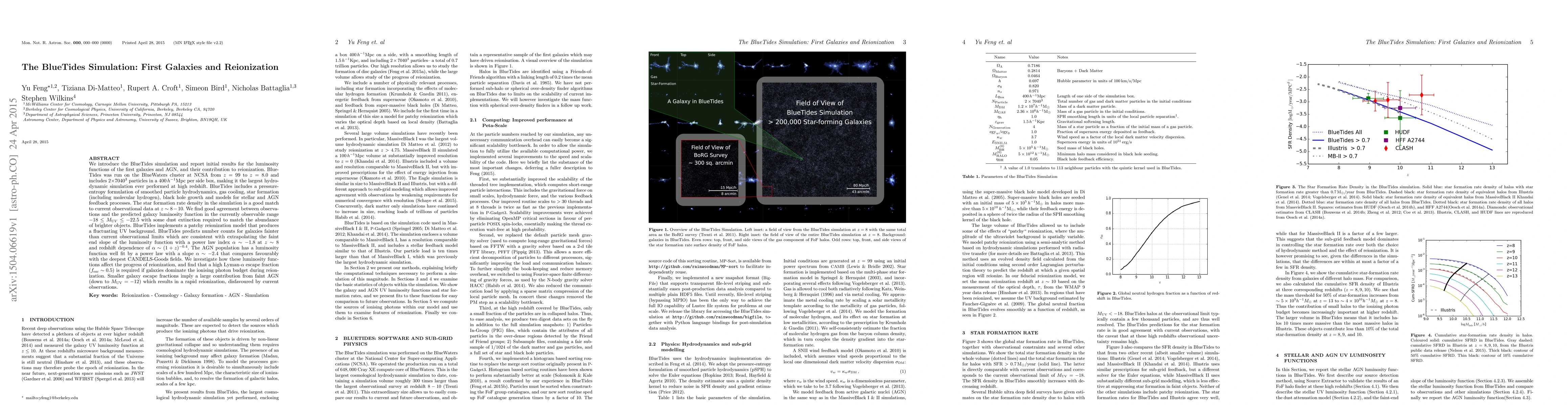 The BlueTides simulation, run on the BlueWaters cluster, models the first galaxies and AGN from $z=99$ to $z=8.0$, showing good agreement with observational data on galaxy luminosity functions and star formation rates. The simulation predicts a high Lyman-$\alpha$ escape fraction is needed for galaxies to dominate reionization, while lower fractions suggest a significant contribution from faint AGN.