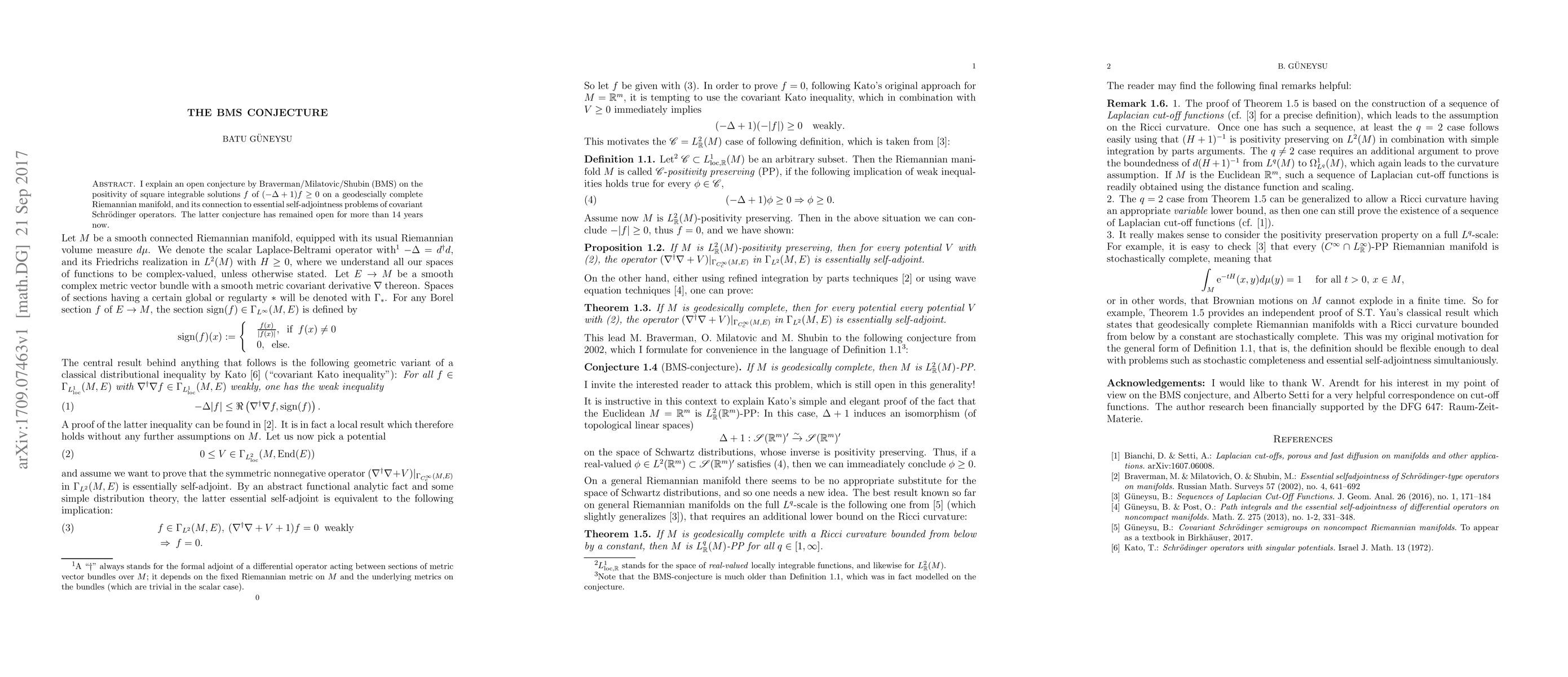I explain an open conjecture by Braverman/Milatovic/Shubin (BMS) on the positivity of square integrable solutions $f$ of $(-\Delta+1)f\geq 0$ on a geodescially complete Riemannian manifold, and its connection to essential self-adjointness problems of covariant Schr\"odinger operators. The latter conjecture has remained open for more than 14 years now.