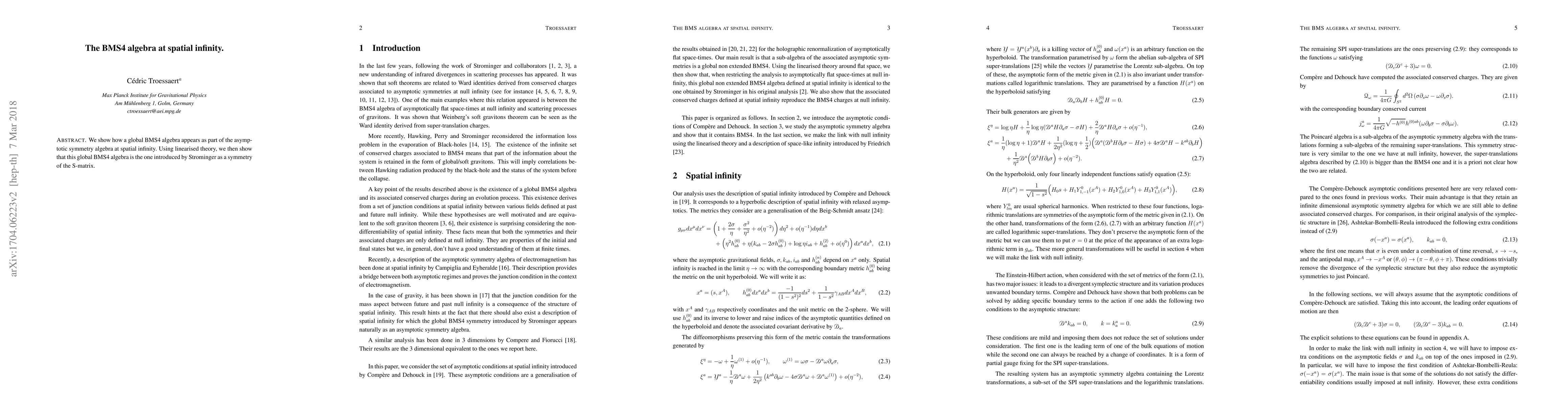 Researchers demonstrate that a global BMS4 algebra appears as the asymptotic symmetry algebra at spatial infinity, matching an earlier proposal by Strominger for the S-matrix symmetry.