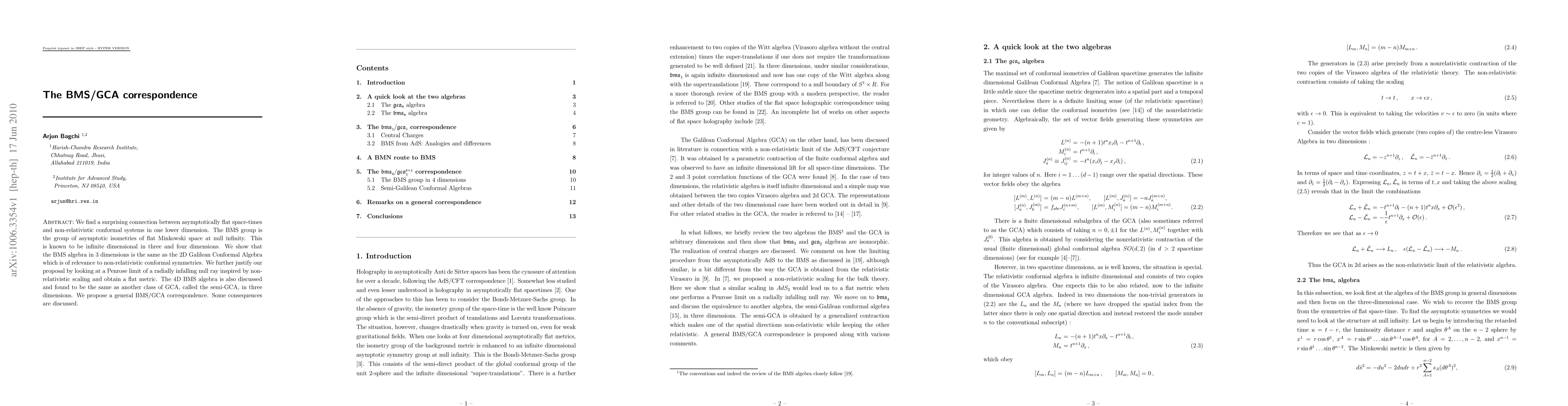 The paper establishes a surprising link between the BMS group of asymptotic symmetries in asymptotically flat space-times and non-relativistic conformal systems, showing that the BMS algebra in 3D matches the 2D Galilean Conformal Algebra (GCA) and the 4D BMS algebra corresponds to a semi-GCA in 3D. The authors propose a general BMS/GCA correspondence and discuss its implications.