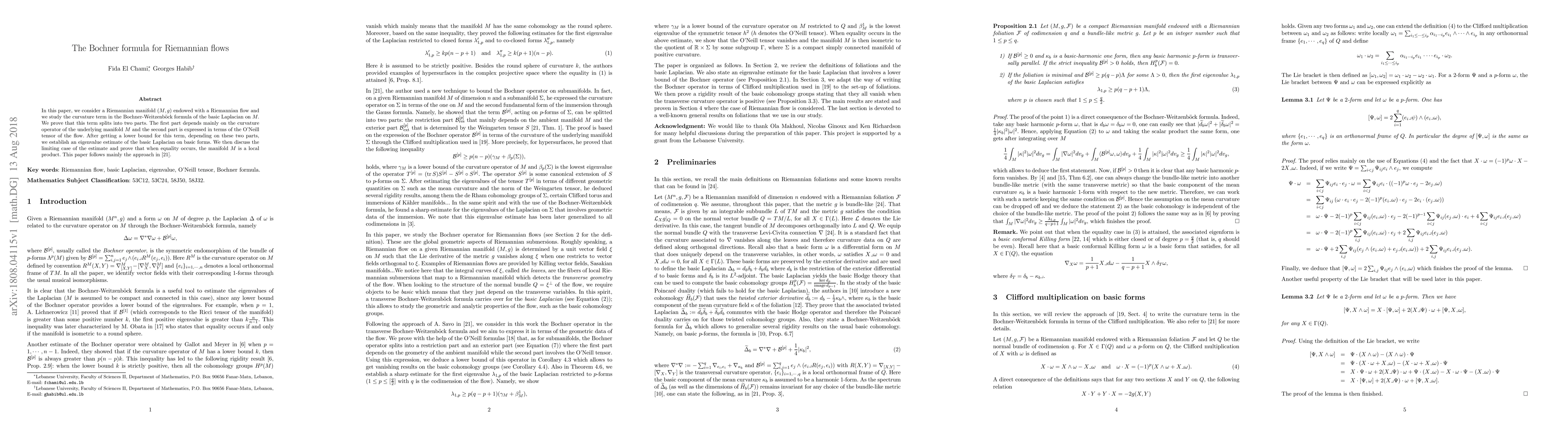 This paper examines the Bochner-Weitzenböck formula for Riemannian flows on a manifold, proving that the curvature term splits into two parts: one linked to the manifold's curvature operator and the other to the flow's O'Neill tensor. An eigenvalue estimate for the basic Laplacian on basic forms is derived, concluding that local product structure characterizes the equality case.