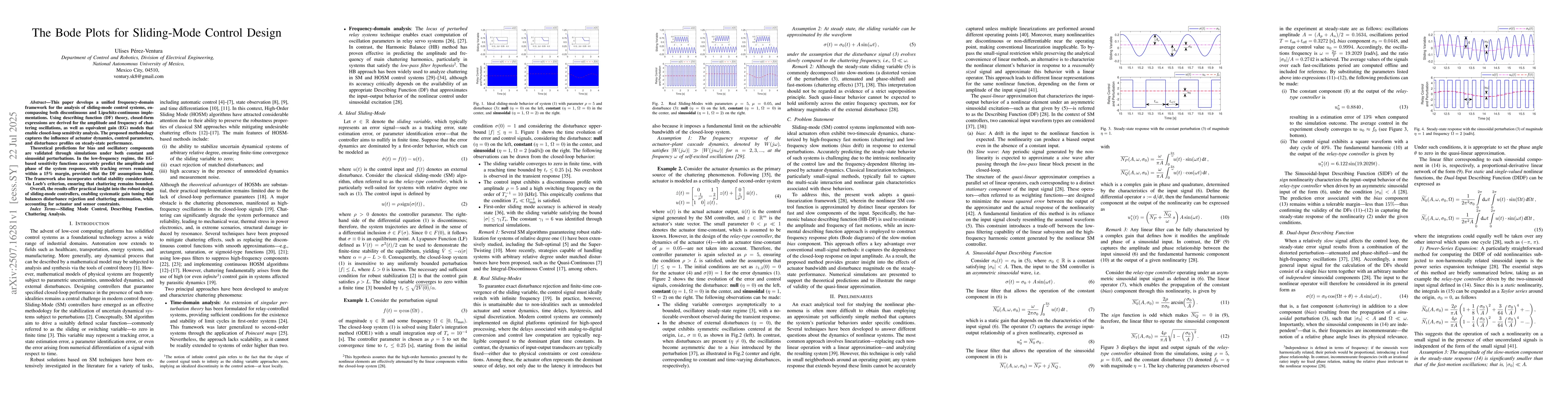 This paper develops a unified frequency-domain framework for the analysis of sliding-mode control systems, encompassing both discontinuous and Lipschitz-continuous implementations. Using describing function (DF) theory, closed-form expressions are derived for the amplitude and frequency of chattering oscillations, as well as equivalent gain (EG) models that enable closed-loop sensitivity analysis. The proposed methodology captures the influence of actuator dynamics, control parameters, and disturbance profiles on steady-state performance. Theoretical predictions for bias and oscillatory components are validated through simulations under both constant and sinusoidal perturbations. In the low-frequency regime, the EG-based sensitivity functions accurately predict the amplitude and phase of the system response, with tracking errors remaining within a 15\% margin, provided that the DF assumptions hold. The framework also incorporates orbital stability considerations via Loebs criterion, ensuring that chattering remains bounded. Overall, the results offer practical insight into the robust design of sliding-mode controllers, enabling systematic gain tuning that balances disturbance rejection and chattering attenuation, while accounting for actuator and sensor constraints.