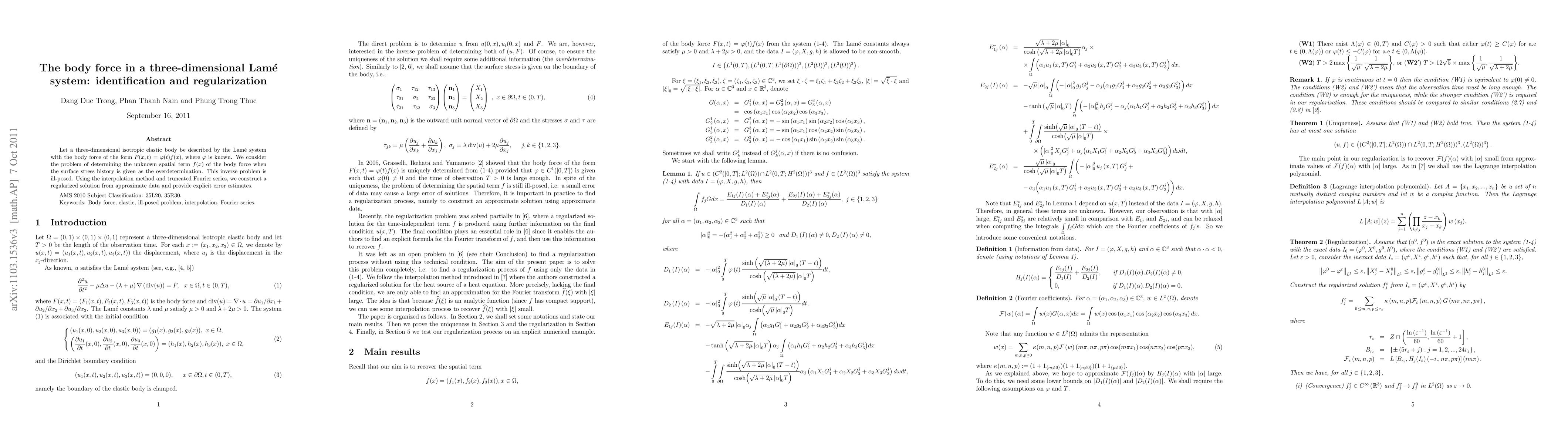 Let a three-dimensional isotropic elastic body be described by the Lam\'e system with the body force of the form $F(x,t)=\phi(t)f(x)$, where $\phi$ is known. We consider the problem of determining the unknown spatial term $f(x)$ of the body force where the surface stress history is given as the overdetermination. This inverse problem is ill-posed. Using the interpolation method and truncated Fourier series, we construct a regularized solution from approximate data and provide explicit error estimates. AMS 2010 Subject Classification: 35L20, 35R30. Keywords: Body force, elastic, ill$-$posed problem, interpolation, Fourier series.