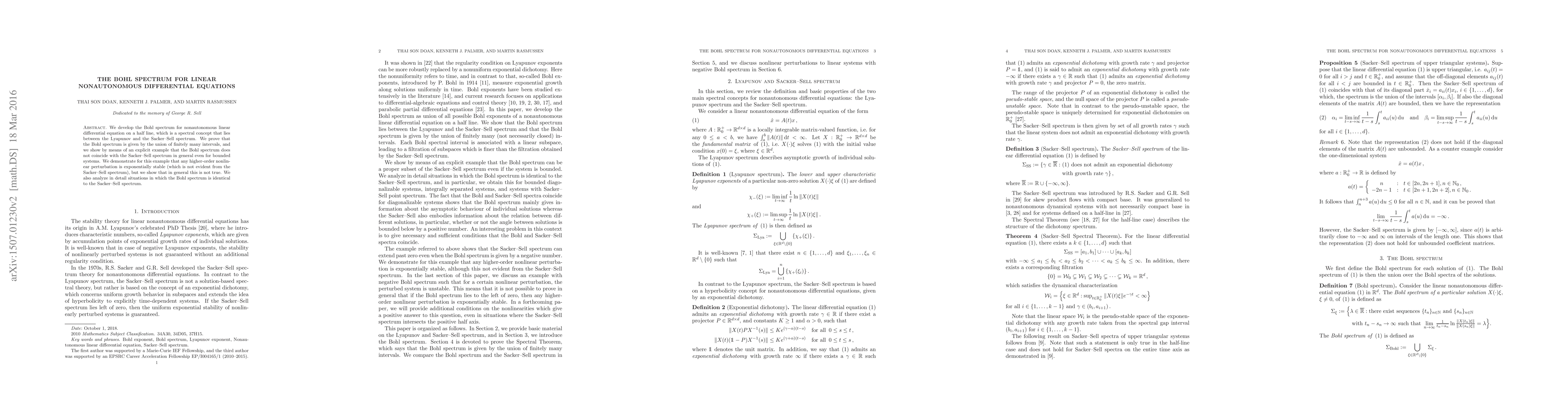 This paper develops the Bohl spectrum for nonautonomous linear differential equations, showing it comprises finitely many intervals and differs from the Sacker-Sell spectrum. An example illustrates exponential stability from the Bohl spectrum not evident in the Sacker-Sell spectrum, while also discussing cases where both spectra coincide.