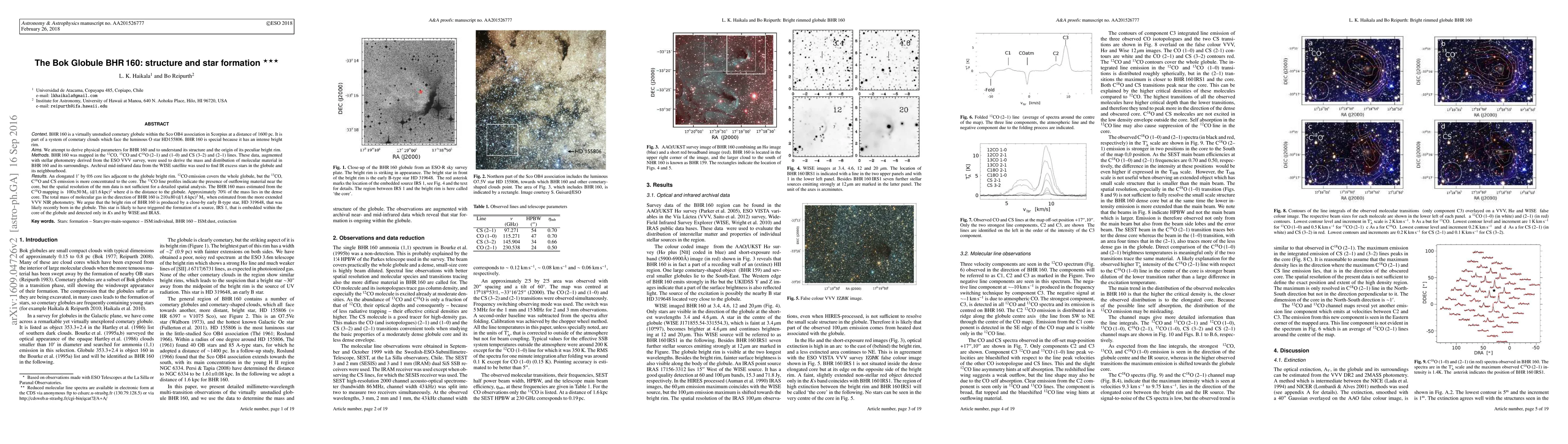 BHR 160 is a virtually unstudied cometary globule within the Sco OB4 association in Scorpius at a distance of 1600pc. It is part of a system of cometary clouds which face the luminous O star HD155806. BHR 160 is special because it has an intense bright rim. We attempt to derive physical parameters for BHR 160 and to understand its structure and the origin of its peculiar bright rim. BHR 160 was mapped in the $^{12}$CO, $^{13}$CO and C$^{18}$O (2-1) and (1-0) and CS (3-2) and (2-1) lines. These data, augmented with stellar photometry derived from the ESO VVV survey, were used to derive the mass and distribution of molecular material in BHR 160 and its surroundings. Archival mid-infrared data from the WISE satellite was used to find IR excess stars in the globule and its neighbourhood. An elongated 1' by 0.6' core lies adjacent to the globule bright rim. $^{12}$CO emission covers the whole globule, but the $^{13}$CO, C$^{18}$O and CS emission is more concentrated to the core. The $^{12}$CO line profiles indicate the presence of outflowing material near the core, but the spatial resolution of the mm data is not sufficient for a detailed spatial analysis. The BHR 160 mass estimated from the C$^{18}$O mapping is 100$\pm$50Msun(d/1.6kpc)$^2$ where d is the distance to the globule. Approximately 70 percent of the mass lies in the dense core. The total mass of molecular gas in the direction of BHR 160 is 210$\pm$(d/1.6kpc)$^2$ Msun when estimated from the more extended VVV NIR photometry. We argue that the bright rim of BHR 160 is produced by a close-by early B-type star, HD 319648, that was likely recently born in the globule. This star is likely to have triggered the formation of a source, IRS 1, that is embedded within the core of the globule and detected only in Ks and by WISE and IRAS.
