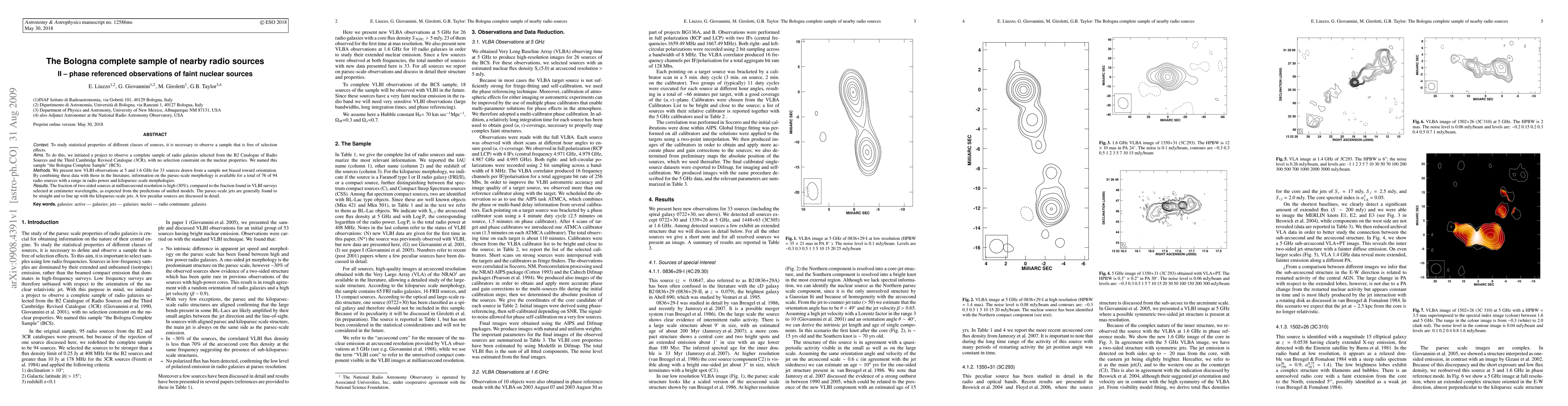 To study statistical properties of different classes of sources, it is necessary to observe a sample that is free of selection effects. To do this, we initiated a project to observe a complete sample of radio galaxies selected from the B2 Catalogue of Radio Sources and the Third Cambridge Revised Catalogue (3CR), with no selection constraint on the nuclear properties. We named this sample "the Bologna Complete Sample" (BCS). We present new VLBI observations at 5 and 1.6 GHz for 33 sources drawn from a sample not biased toward orientation. By combining these data with those in the literature, information on the parsec-scale morphology is available for a total of 76 of 94 radio sources with a range in radio power and kiloparsec-scale morphologies. The fraction of two-sided sources at milliarcsecond resolution is high (30%), compared to the fraction found in VLBI surveys selected at centimeter wavelengths, as expected from the predictions of unified models. The parsec-scale jets are generally found to be straight and to line up with the kiloparsec-scale jets. A few peculiar sources are discussed in detail.