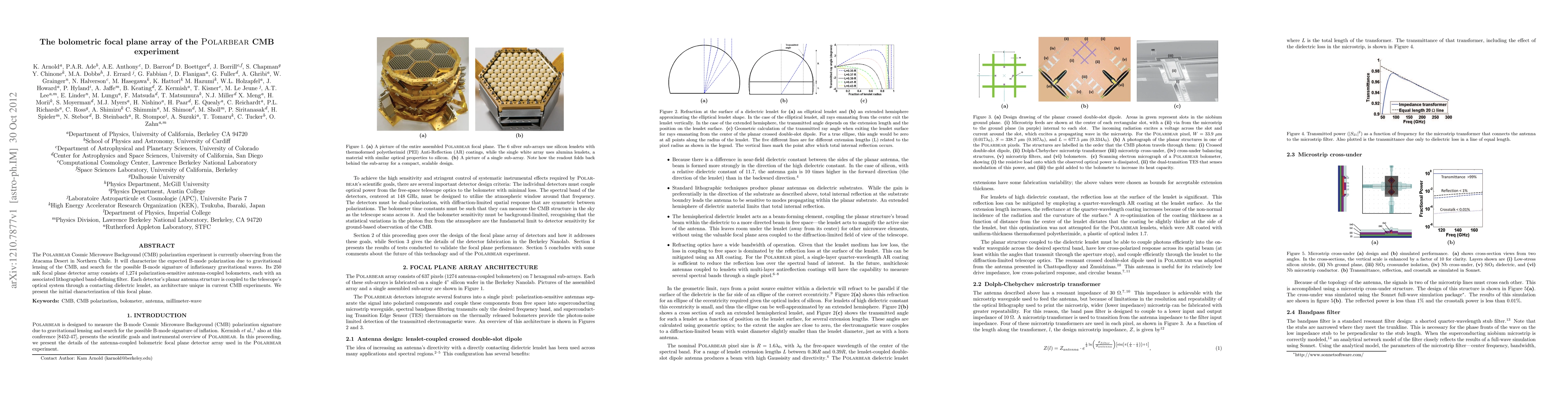 The Polarbear CMB experiment in the Atacama Desert aims to detect B-mode polarization from the CMB, including signatures of gravitational lensing and inflationary gravitational waves. Its focal plane array features 1,274 polarization-sensitive bolometers, each with a unique dielectric lenslet coupling, and this summary presents the initial characterization of the array.