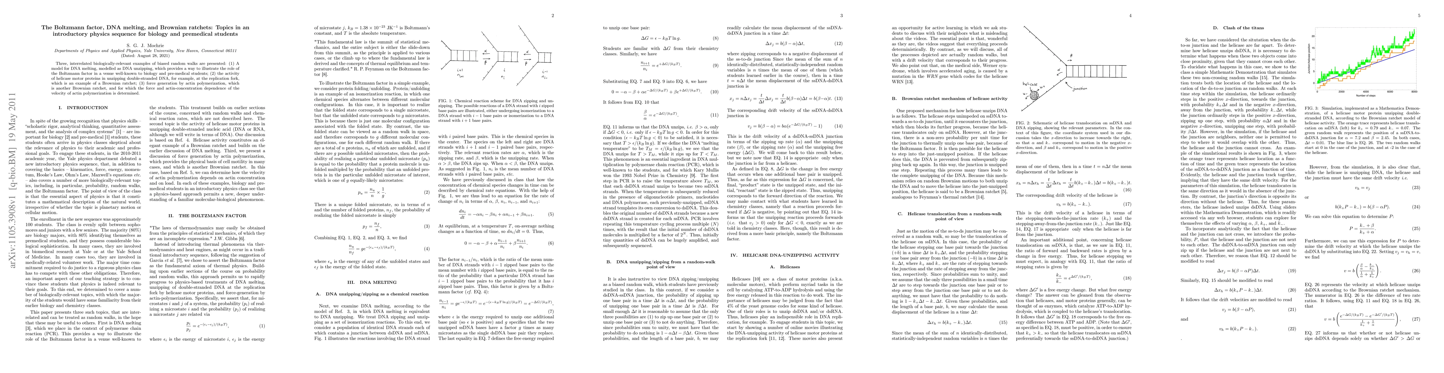 Three, interrelated biologically-relevant examples of biased random walks are presented: (1) A model for DNA melting, modelled as DNA unzipping, which provides a way to illustrate the role of the Boltzmann factor in a venue well-known to biology and pre-medical students; (2) the activity of helicase motor proteins in unzipping double-stranded DNA, for example, at the replication fork, which is an example of a Brownian ratchet; (3) force generation by actin polymerization, which is another Brownian ratchet, and for which the force and actin-concentration dependence of the velocity of actin polymerization is determined.