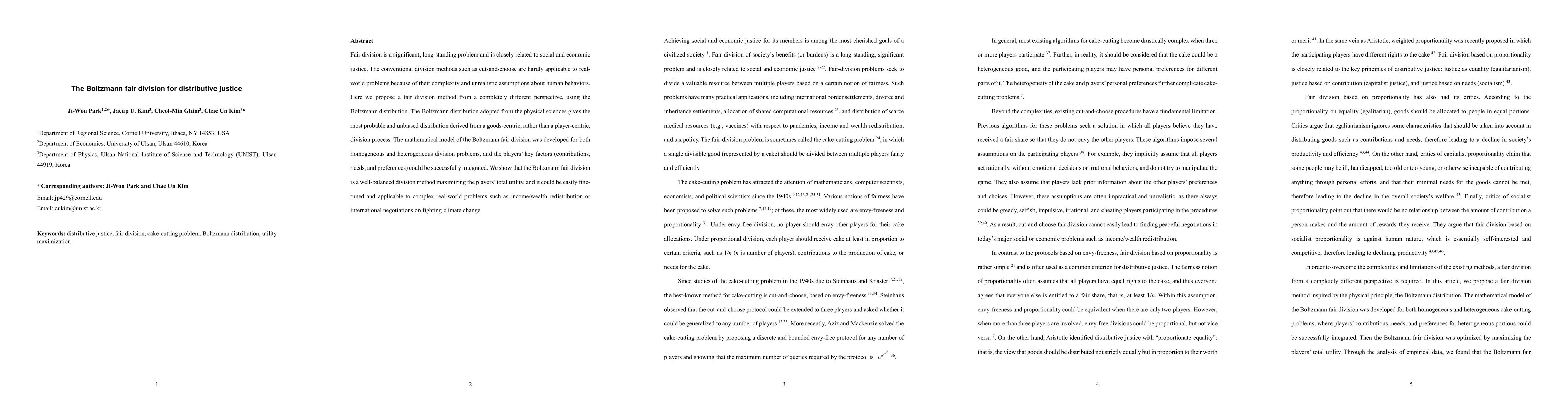 This paper proposes a novel fair division method based on the Boltzmann distribution, offering a goods-centric approach that maximizes total utility and integrates players' contributions, needs, and preferences. The method is shown to be effective and adaptable for complex real-world issues like wealth redistribution and climate change negotiations.