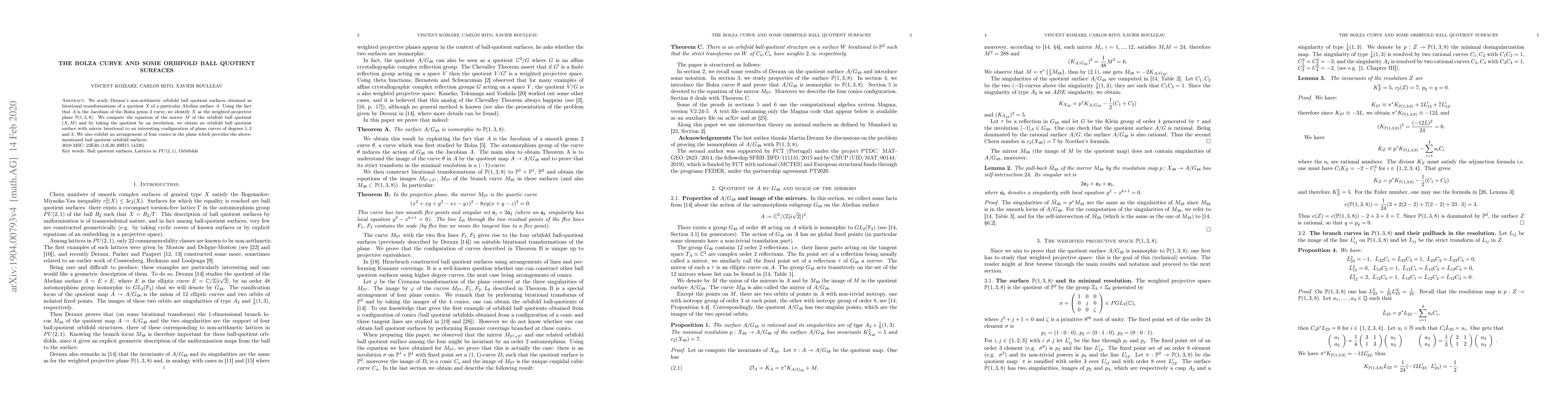 We study Deraux's non arithmetic orbifold ball quotient surfaces obtained as birational transformations of a quotient $X$ of a particular Abelian surface $A$. Using the fact that $A$ is the Jacobian of the Bolza genus $2$ curve, we identify $X$ as the weighted projective plane $\mathbb{P}(1,3,8)$. We compute the equation of the mirror $M$ of the orbifold ball quotient $(X,M)$ and by taking the quotient by an involution, we obtain an orbifold ball quotient surface with mirror birational to an interesting configuration of plane curves of degrees $1,2$ and $3$. We also exhibit an arrangement of four conics in the plane which provides the above-mentioned ball quotient orbifold surfaces.