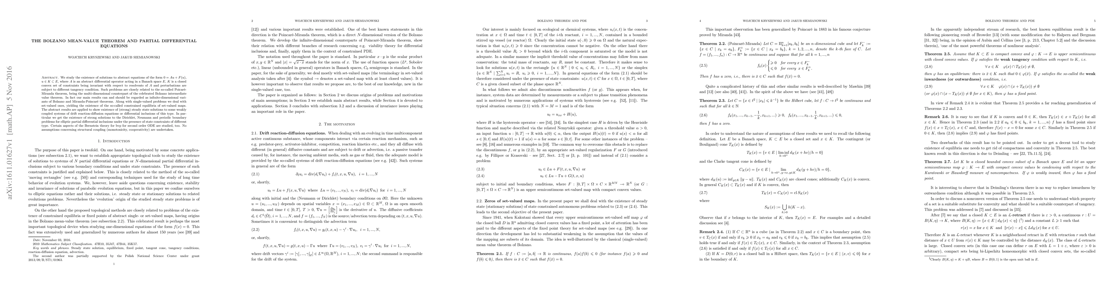 This paper explores the existence of solutions to abstract differential equations using the Bolzano mean-value theorem in infinite-dimensional spaces, extending the Poincaré-Miranda theorem to partial differential equations. It applies these results to show the existence of steady-state solutions for weakly coupled drift reaction-diffusion systems and elliptic partial differential inclusions under state constraints.