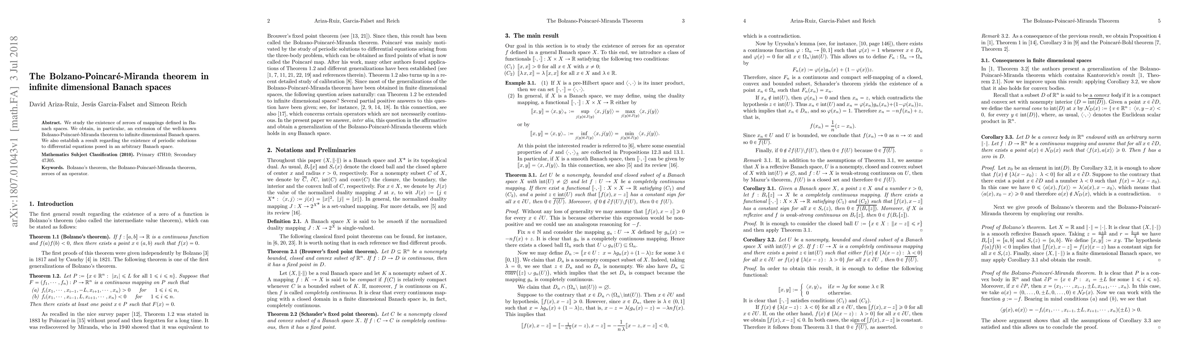 This paper extends the Bolzano-Poincaré-Miranda theorem to infinite dimensional Banach spaces and establishes the existence of periodic solutions for differential equations in such spaces. The study focuses on zeroes of mappings in Banach spaces.