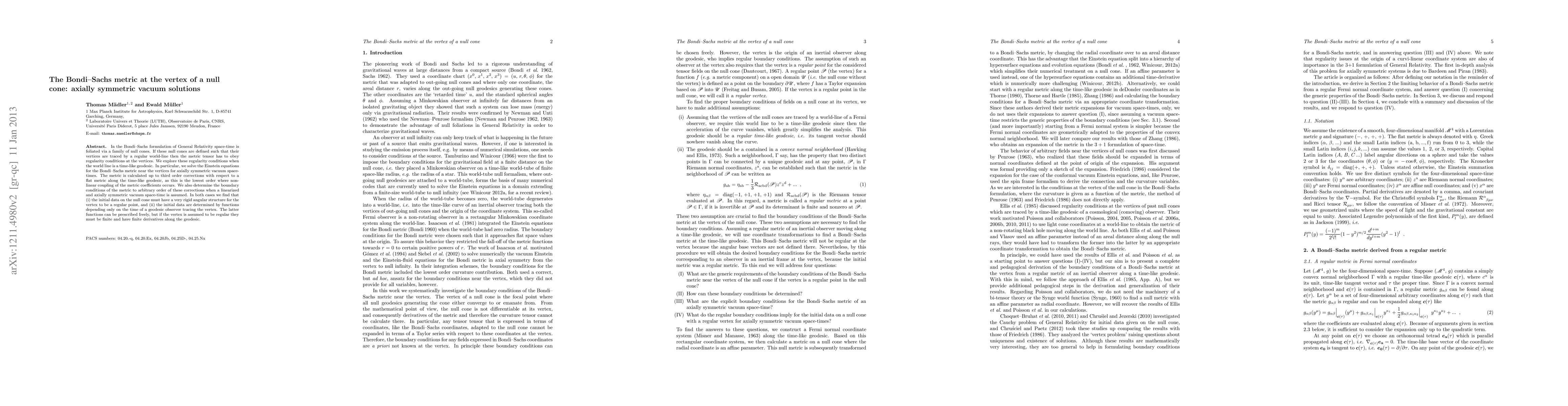 This paper investigates the regularity conditions for the Bondi-Sachs metric at the vertex of a null cone in axially symmetric vacuum space-times, solving the Einstein equations up to third order. It finds that the initial data must have a rigid angular structure and be finite with finite derivatives for the vertex to be regular.