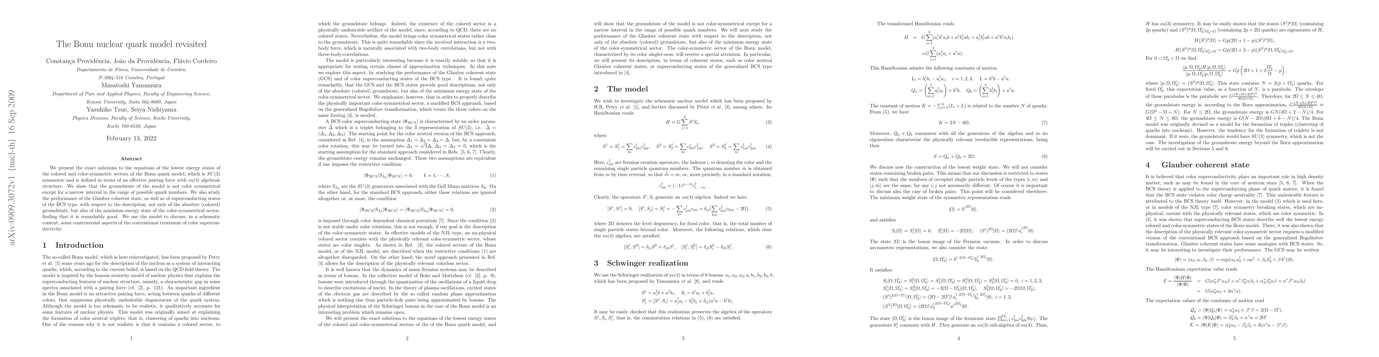 The Bonn nuclear quark model reveals that its ground state is not color symmetrical except for a narrow interval, but it performs well with Glauber coherent states and BCS superconducting states.