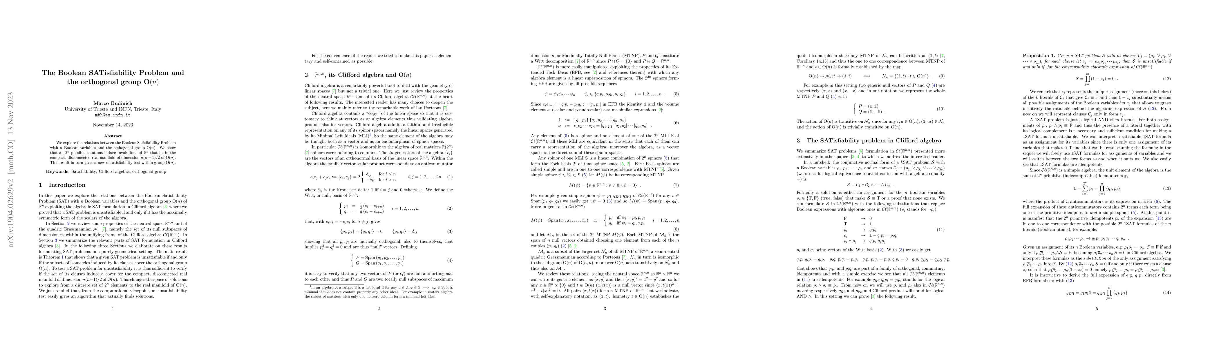 This paper investigates the connection between the Boolean Satisfiability Problem and the orthogonal group $O(n)$, demonstrating that all $2^n$ solutions correspond to involutions within $O(n)$, leading to a novel unsatisfiability test based on this relationship.