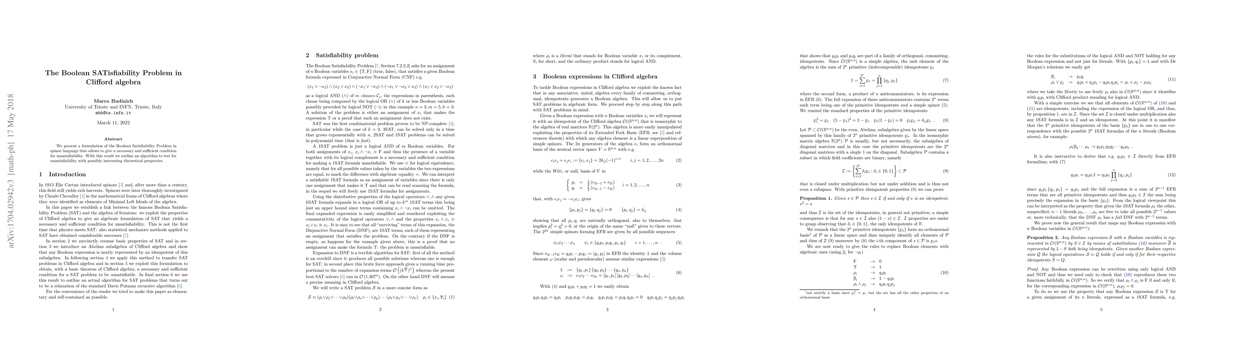 This paper formulates the Boolean Satisfiability Problem (SAT) using Clifford algebra, providing a necessary and sufficient condition for unsatisfiability and proposing an algorithm with potentially interesting theoretical properties for testing unsatisfiability.