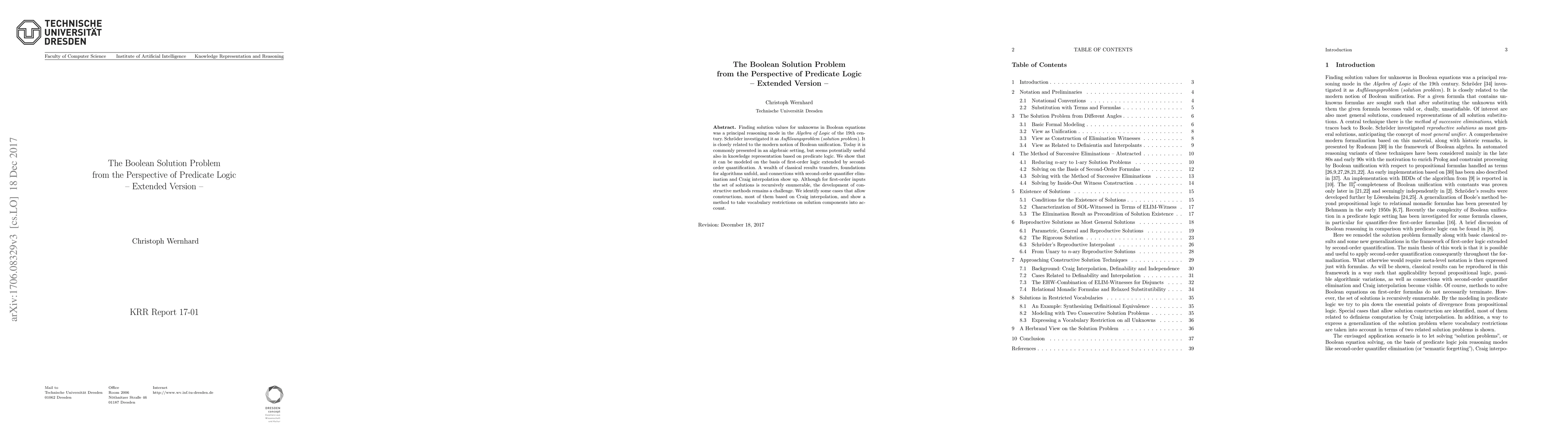 Finding solution values for unknowns in Boolean equations was a principal reasoning mode in the Algebra of Logic of the 19th century. Schr\"oder investigated it as "Aufl\"osungsproblem" ("solution problem"). It is closely related to the modern notion of Boolean unification. Today it is commonly presented in an algebraic setting, but seems potentially useful also in knowledge representation based on predicate logic. We show that it can be modeled on the basis of first-order logic extended by second-order quantification. A wealth of classical results transfers, foundations for algorithms unfold, and connections with second-order quantifier elimination and Craig interpolation show up. Although for first-order inputs the set of solutions is recursively enumerable, the development of constructive methods remains a challenge. We identify some cases that allow constructions, most of them based on Craig interpolation, and show a method to take vocabulary restrictions on solution components into account.