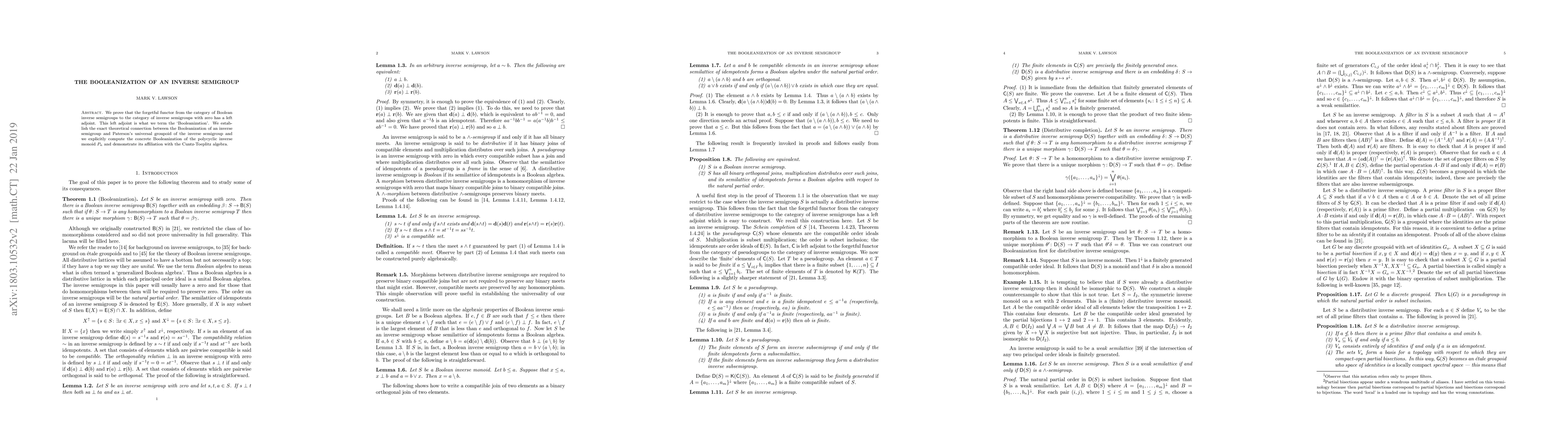 A new concept called Booleanization is introduced as a left adjoint to the forgetful functor from Boolean inverse semigroups to general inverse semigroups with zero, demonstrating a connection between this process and Paterson's universal groupoid.