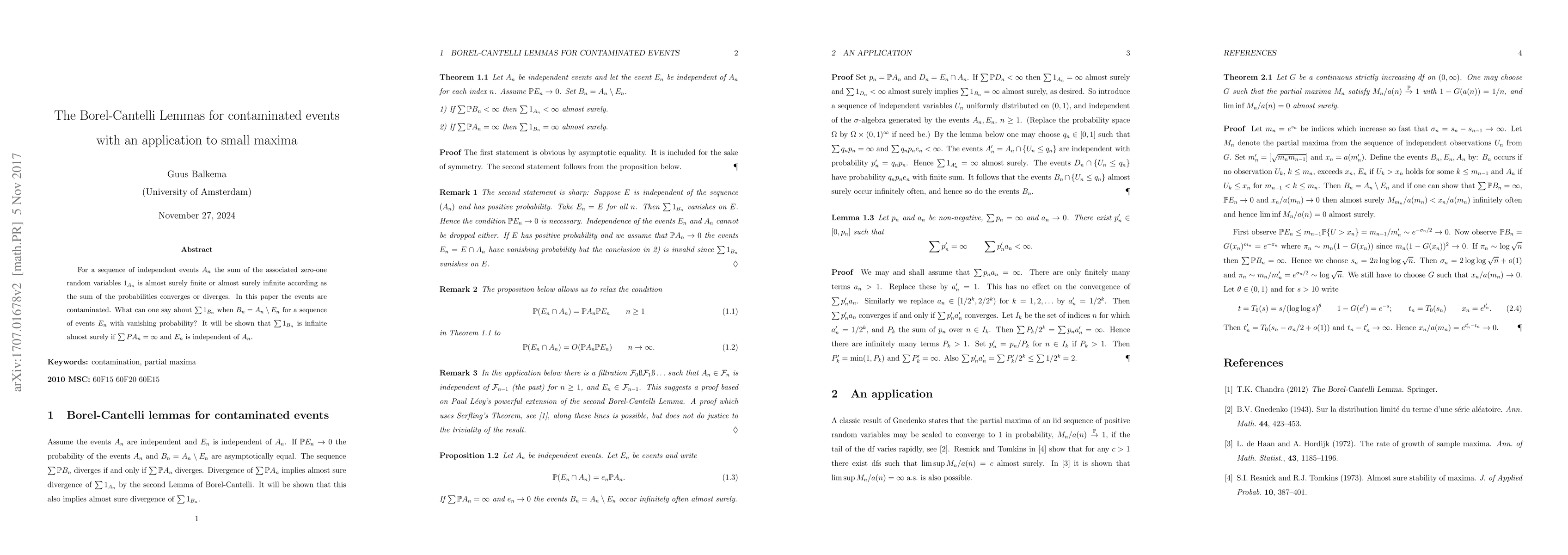 This paper investigates the Borel-Cantelli lemmas for sequences of independent events that are "contaminated" by another sequence of events with vanishing probability. It proves a new lemma for these contaminated events and applies it to extreme value theory.